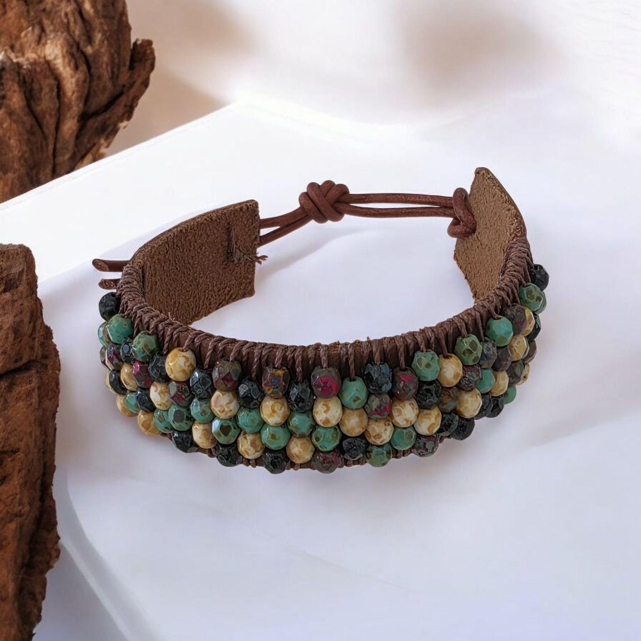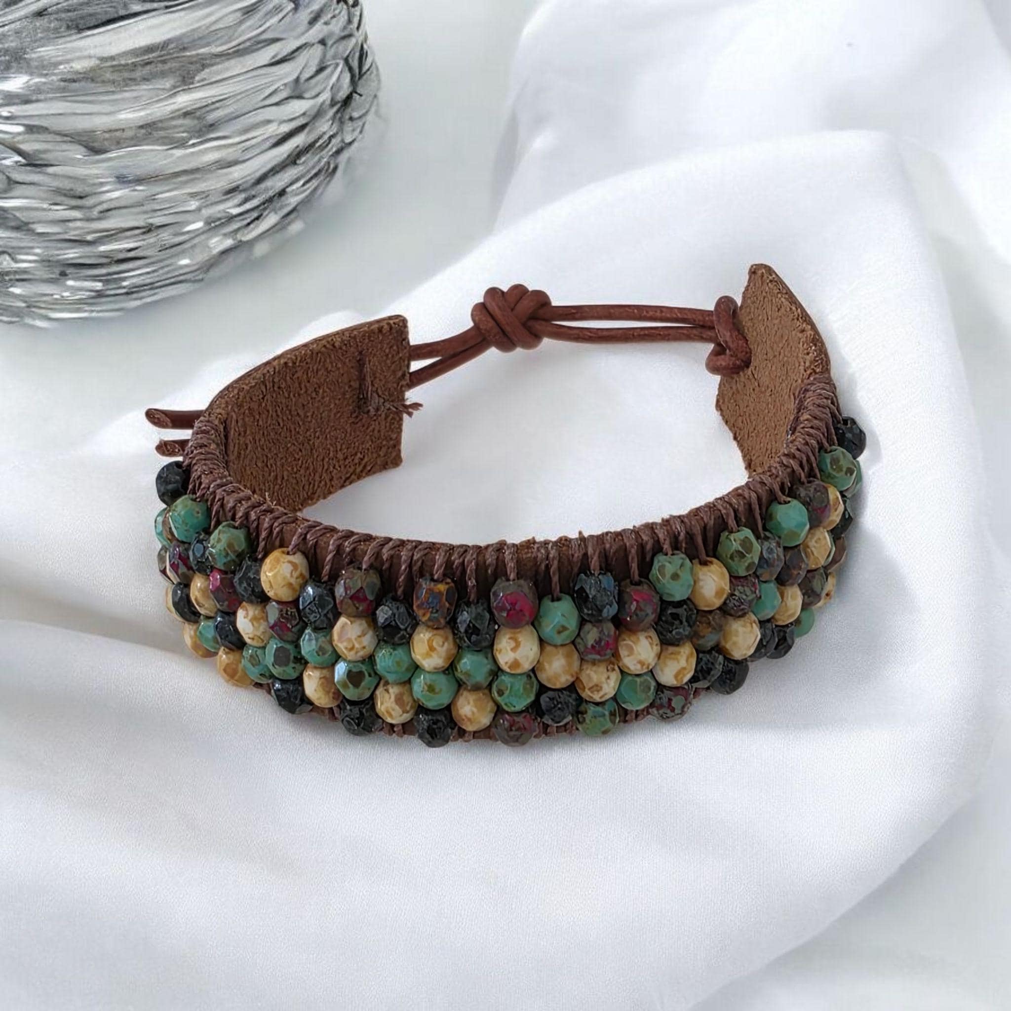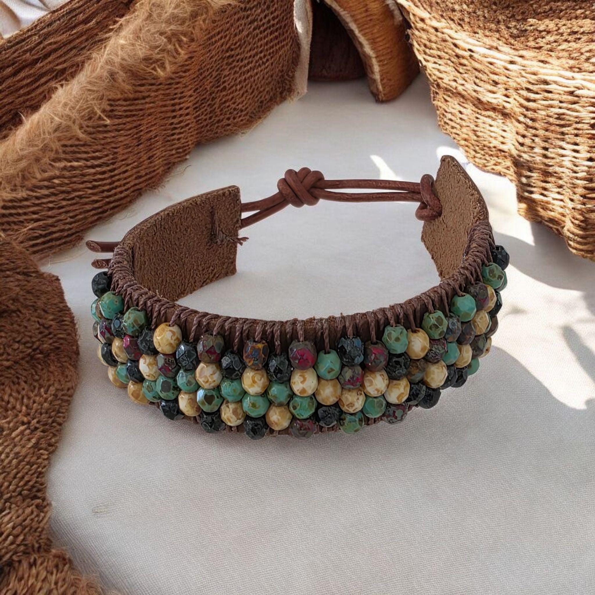 Leather cuff bracelet with czech glass beads, southwest style jewelry