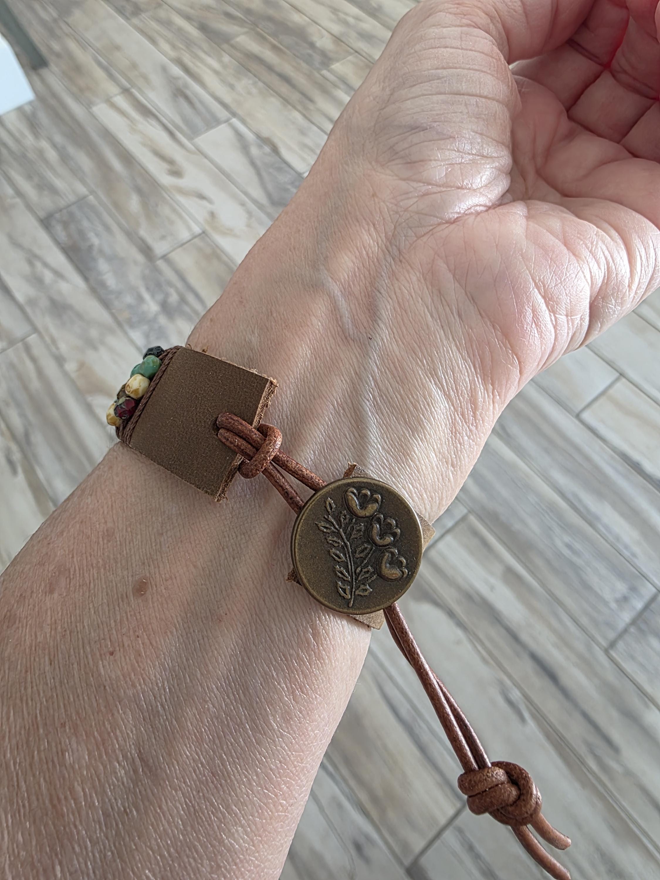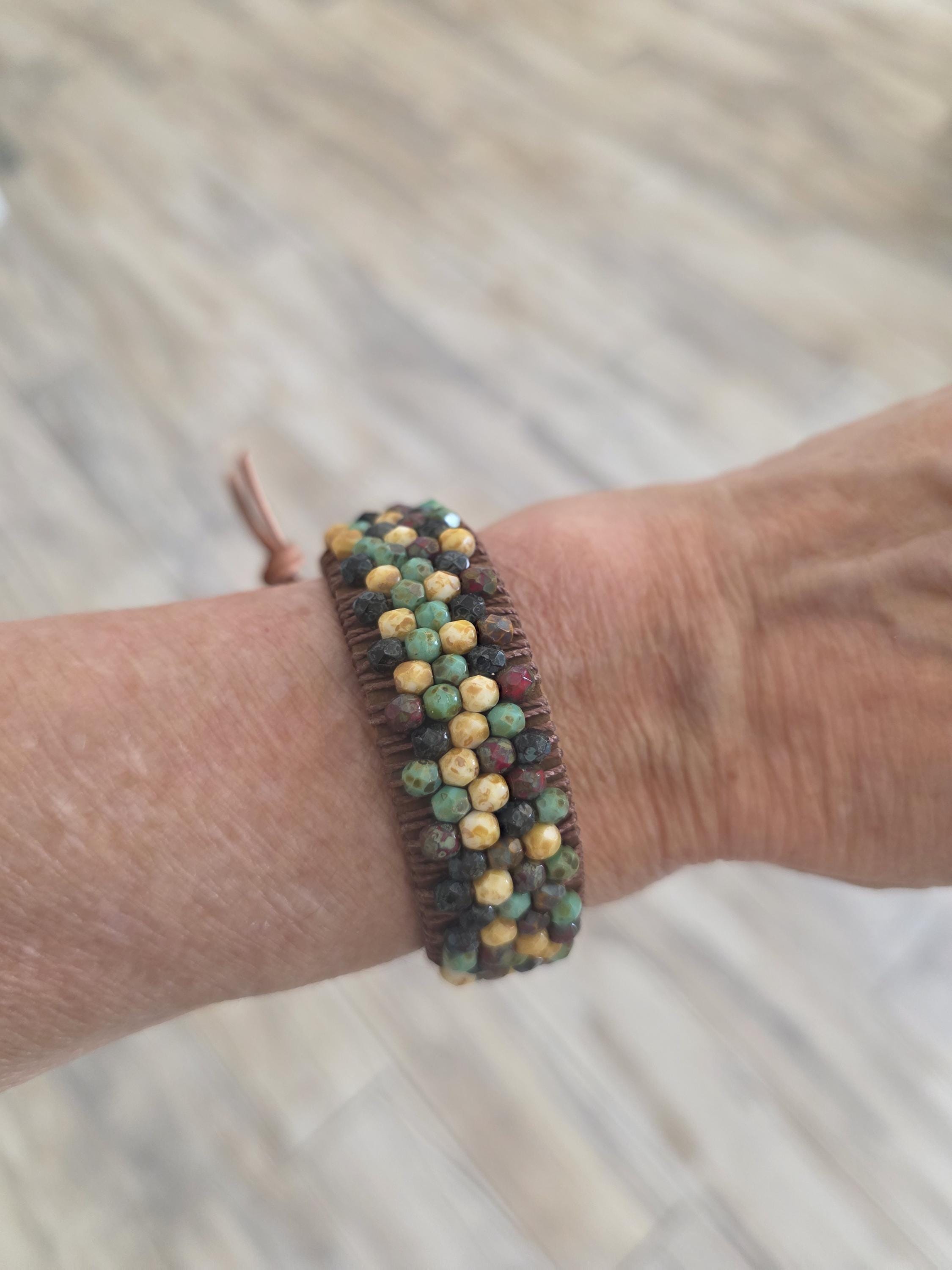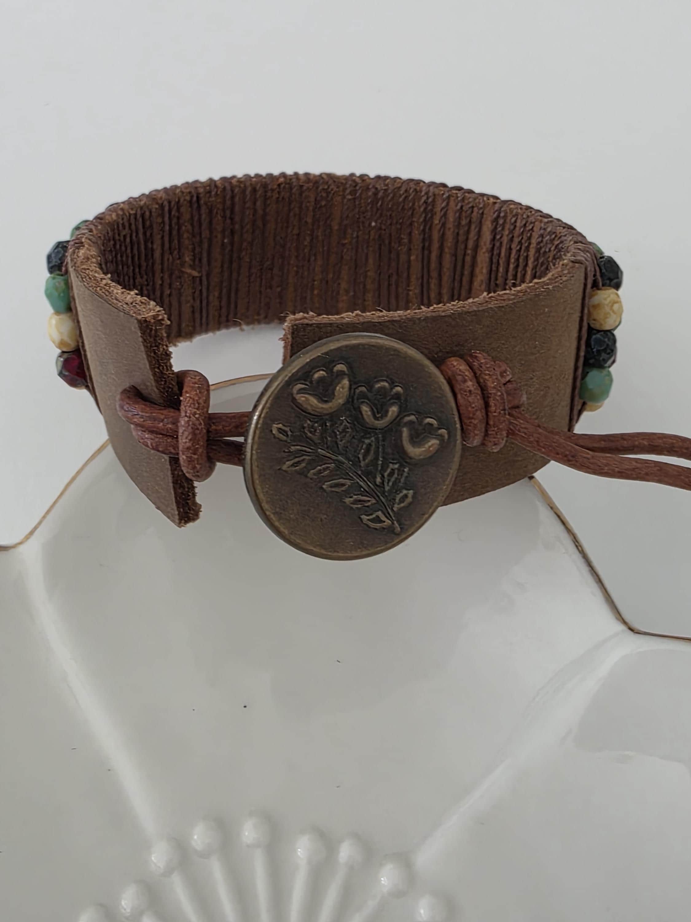 Leather cuff bracelet with czech glass beads, southwest style jewelry