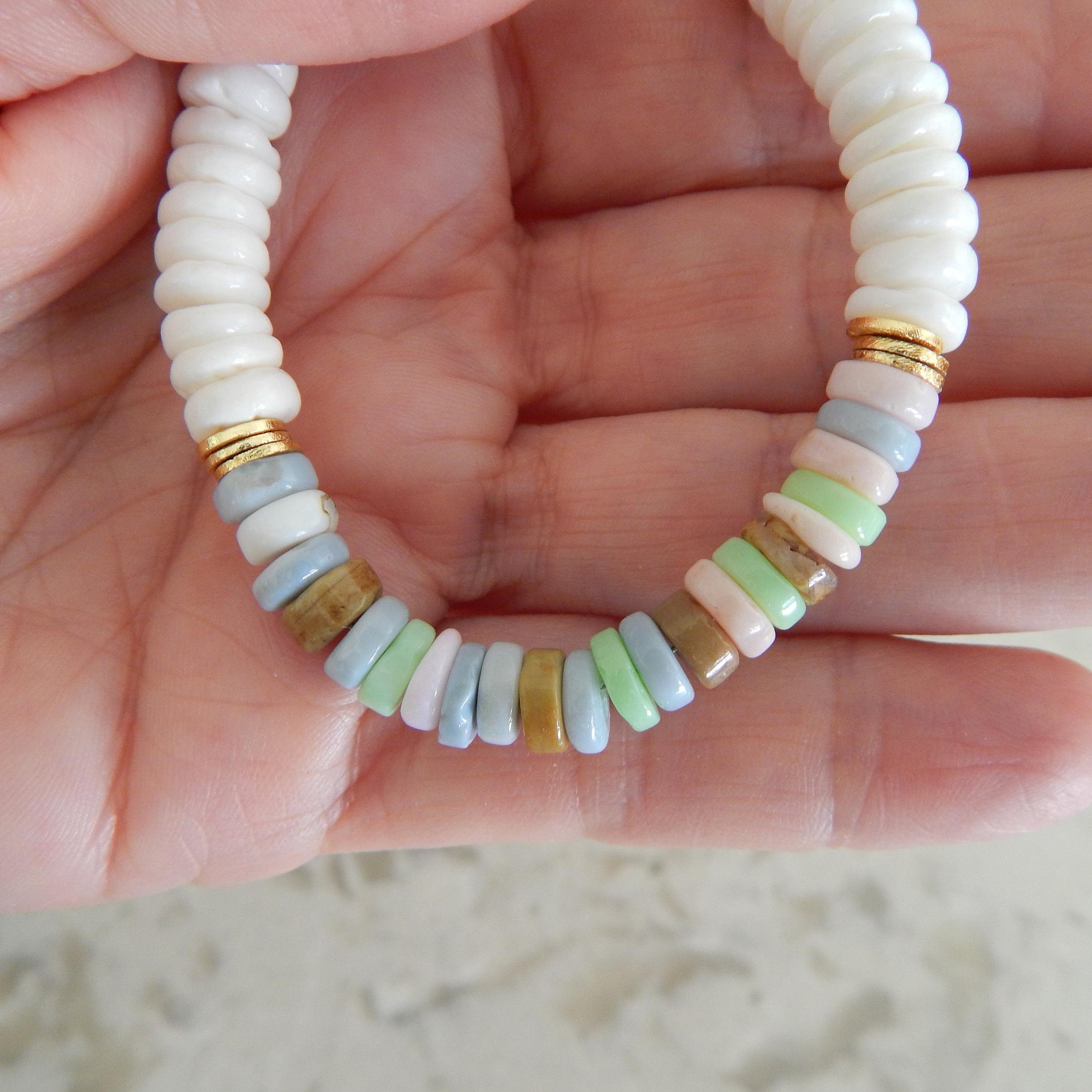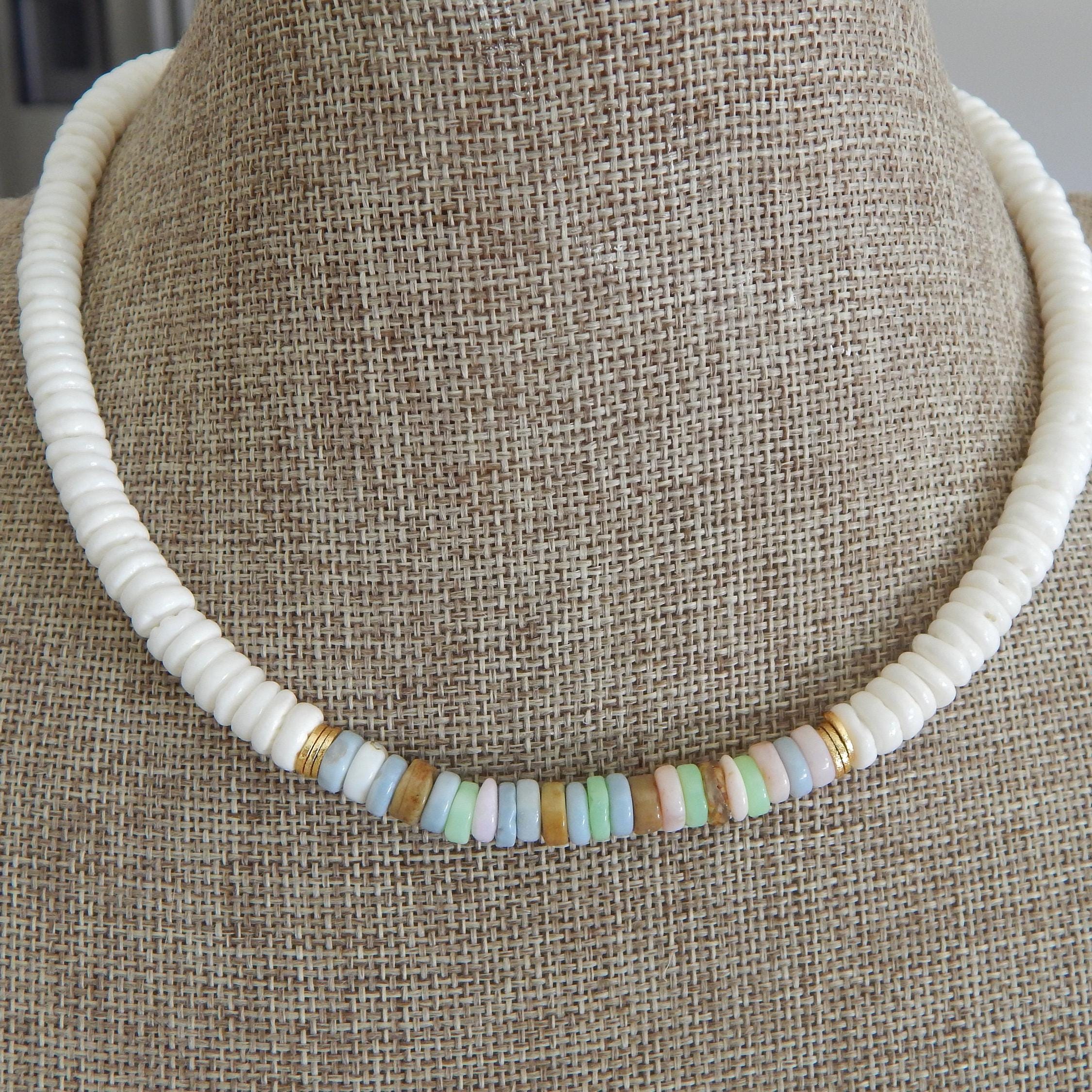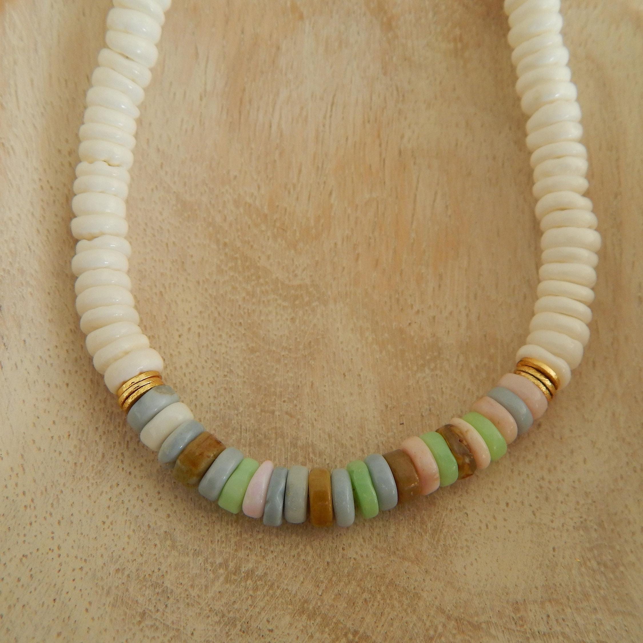 White shell heishi and multi gemstone necklace, beach jewelry, shell choker