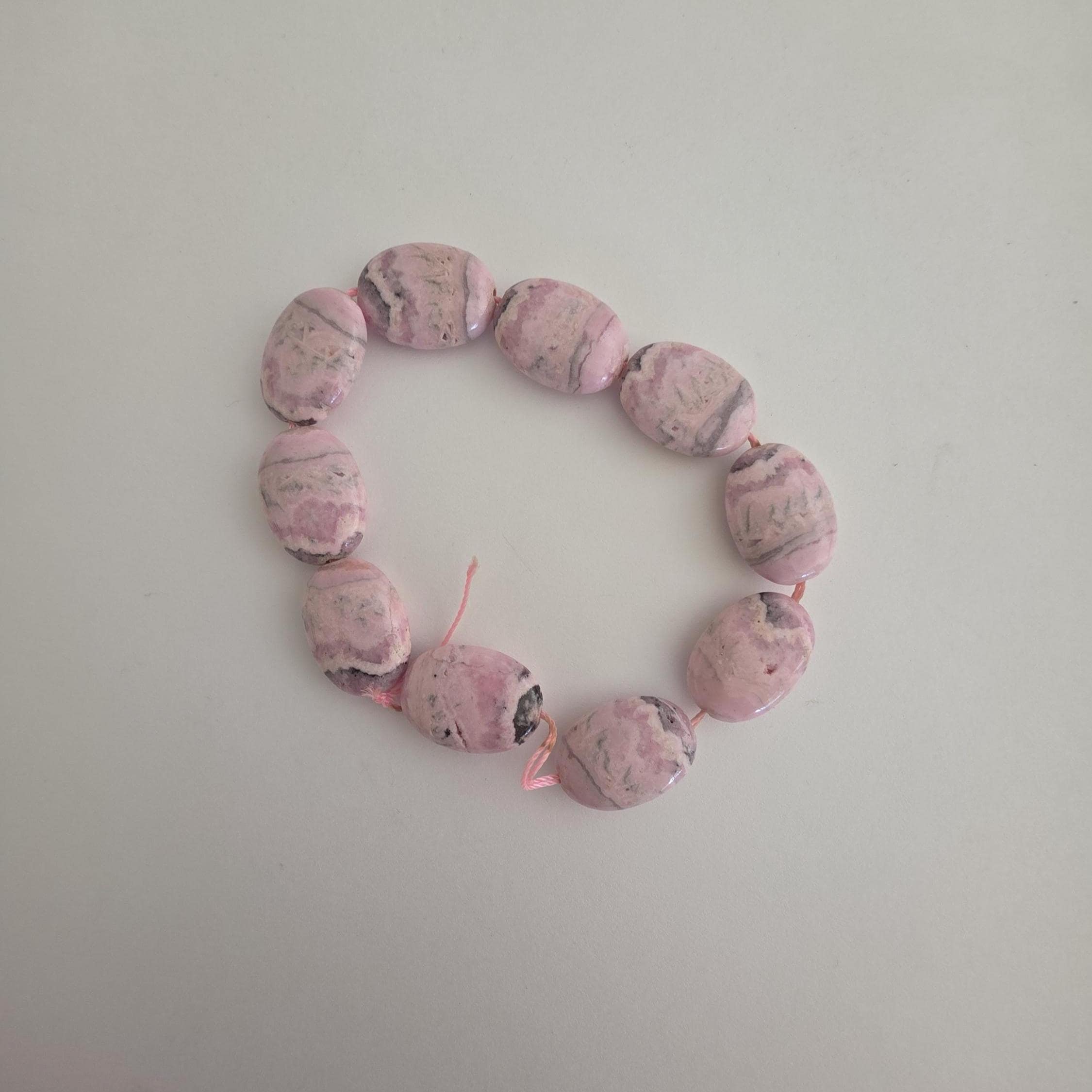 A beautiful pink rhodochrosite coin shape bead is wire wrapped in your choice of either silver or gold wire.