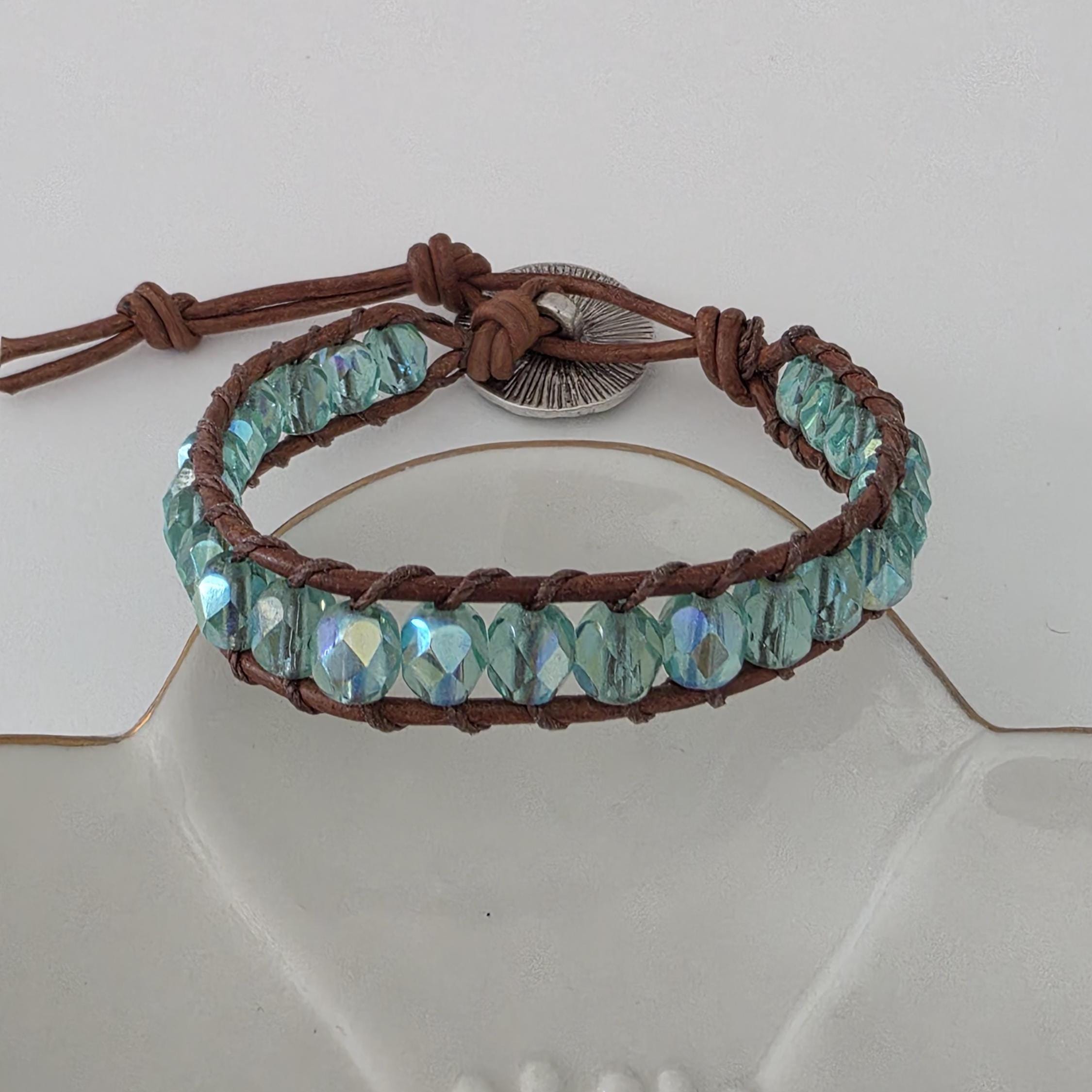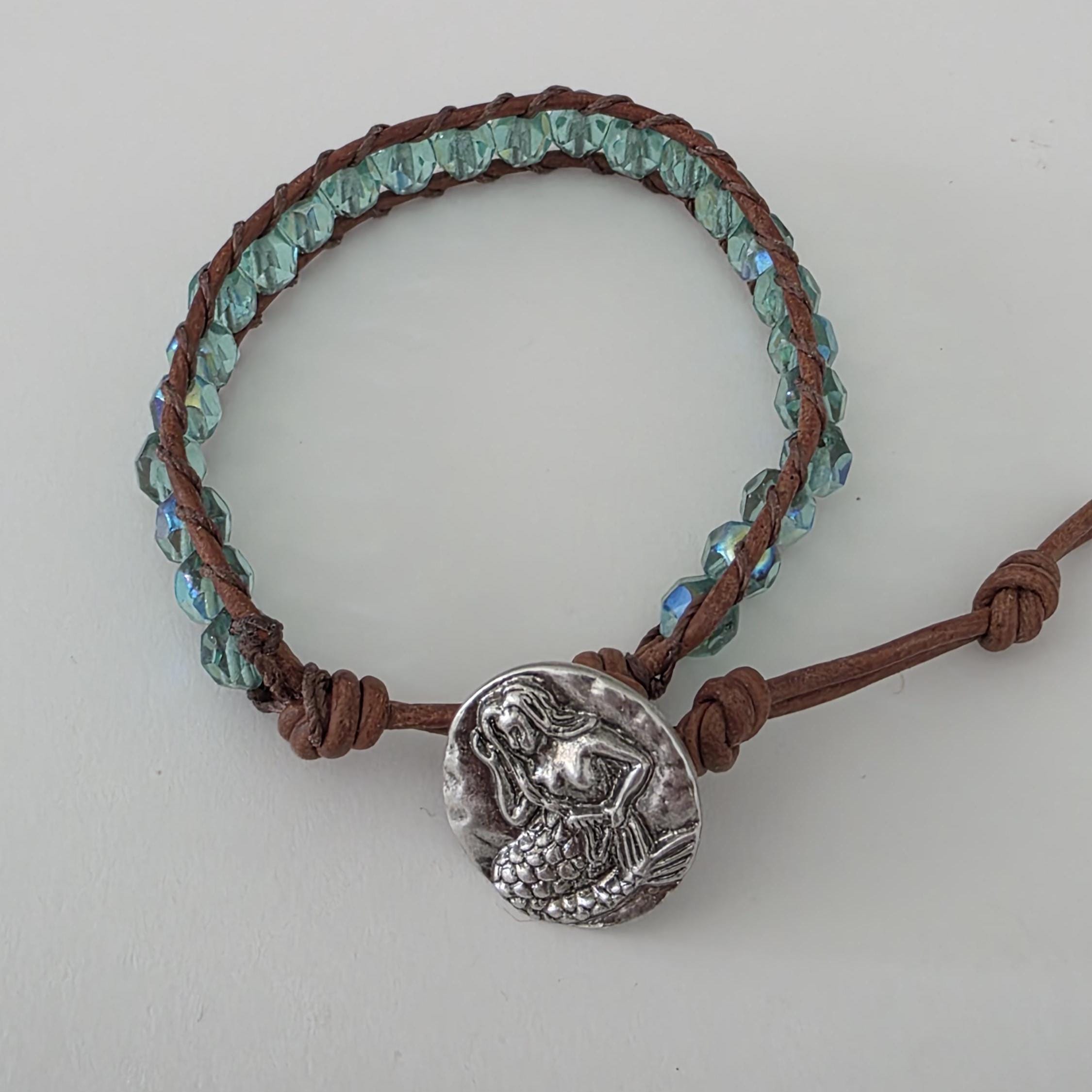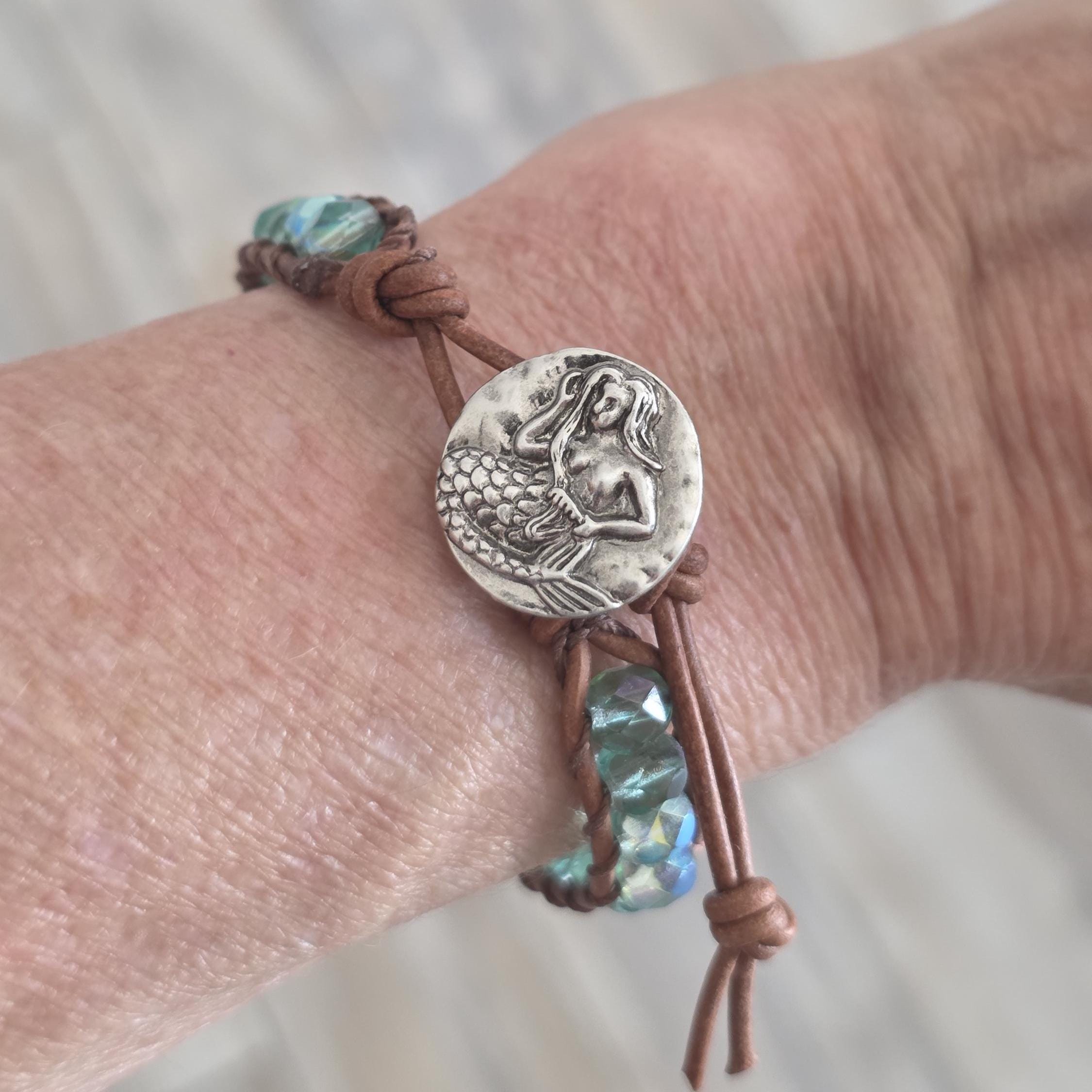 Beautiful aqua blue czech glass beads are wrapped onto brown leather cord and finished with a silver plate mermaid button.