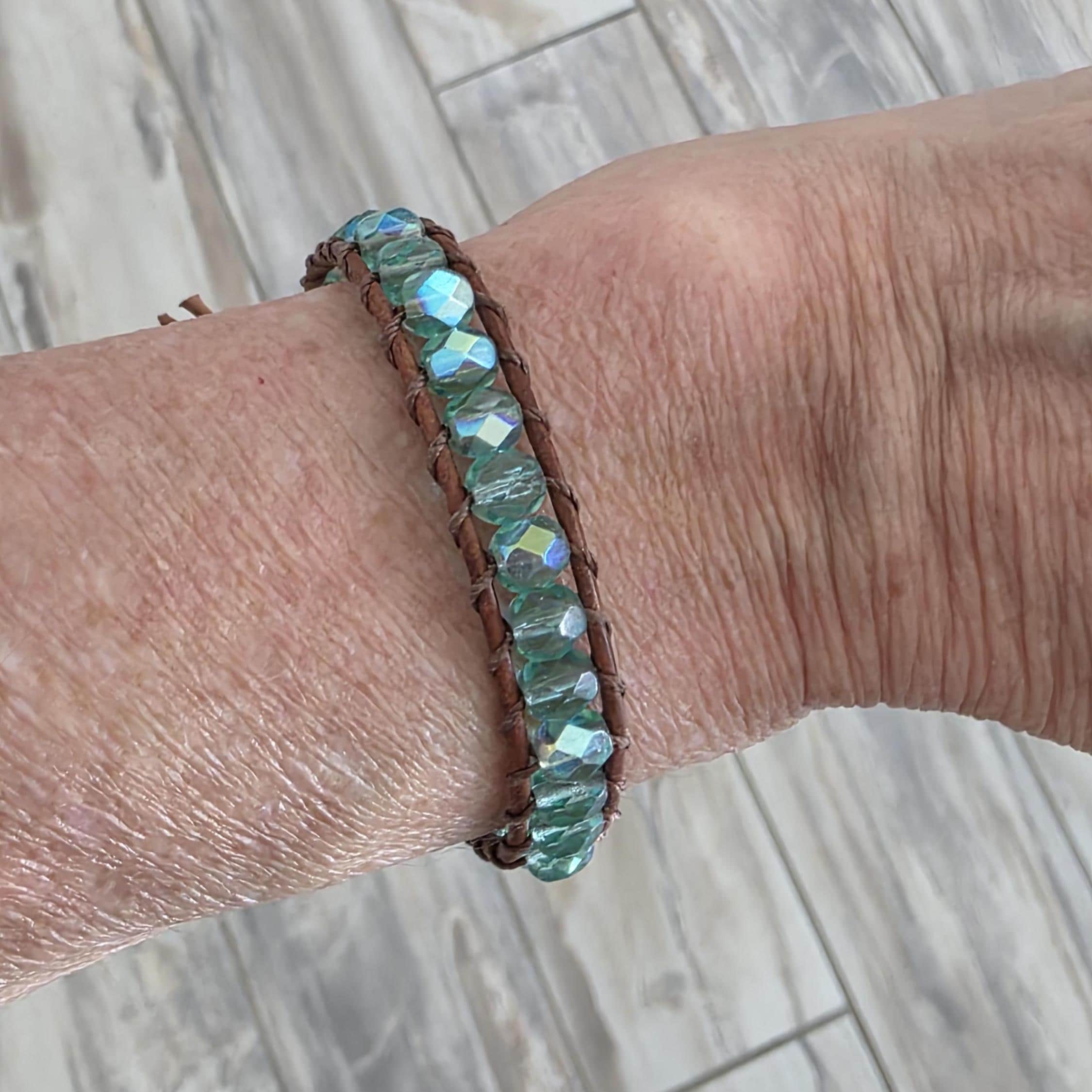 Aqua blue czech glass leather wrap bracelet, mermaid button