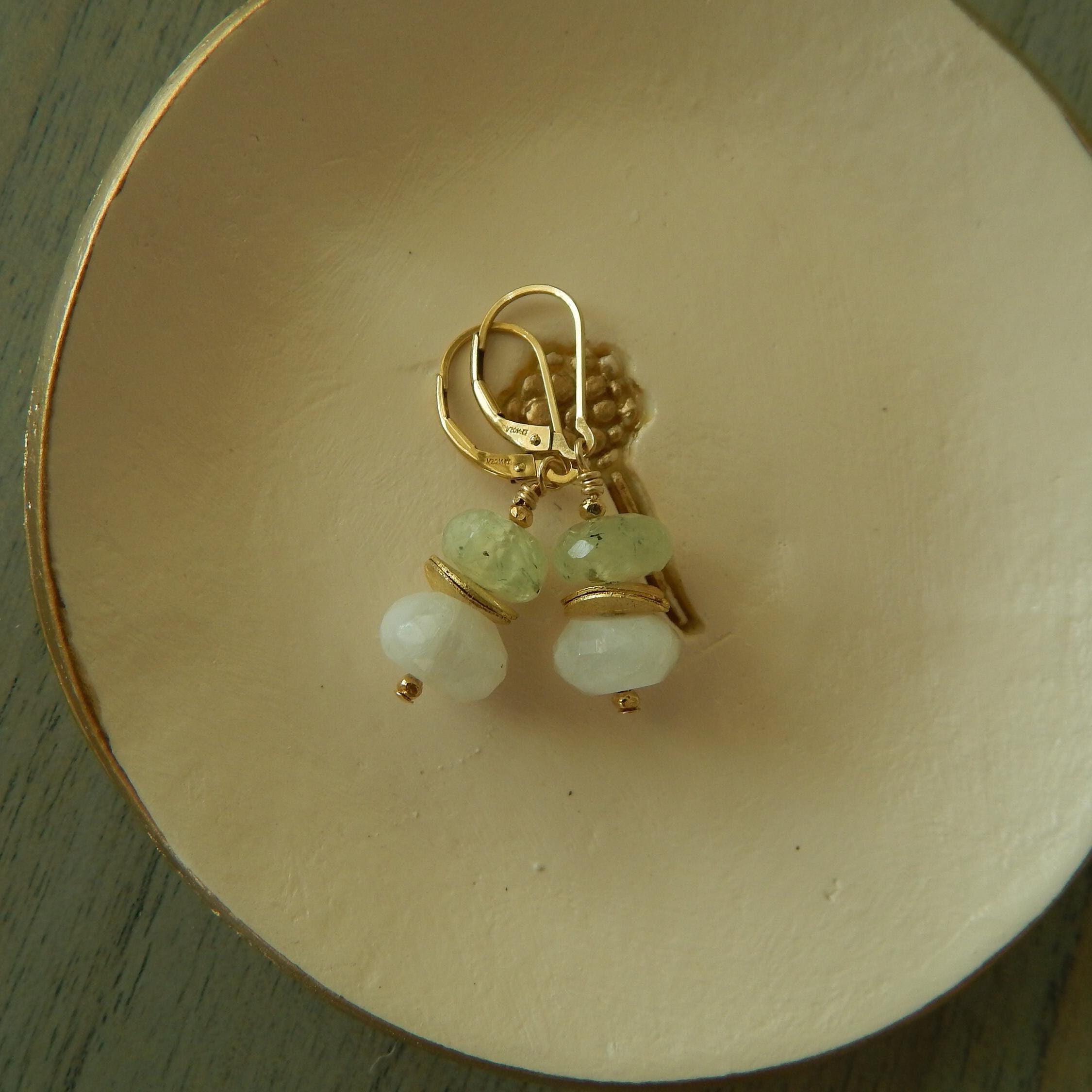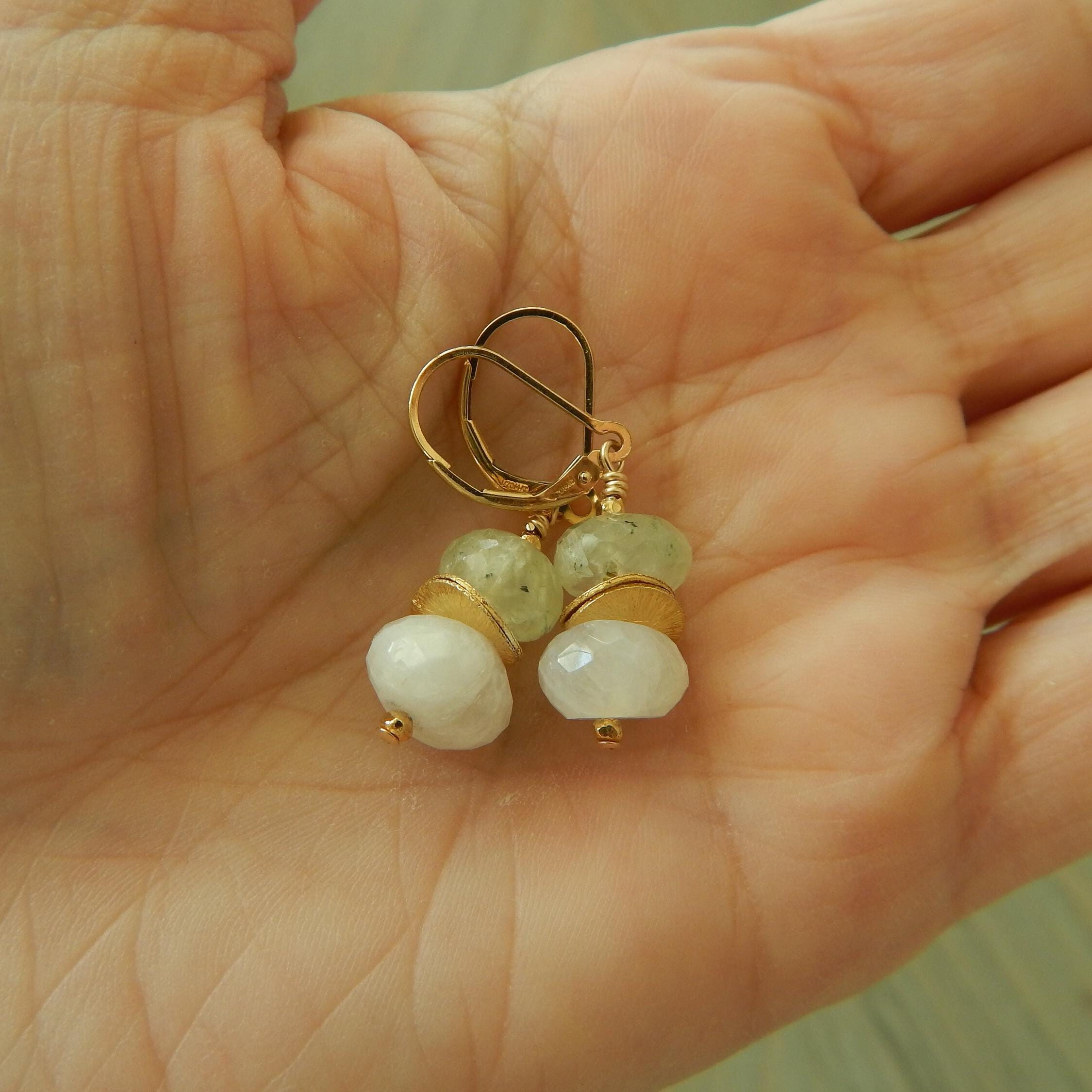Moonstone and prehnite dangle earrings, gold filled leverbacks, boho jewelry