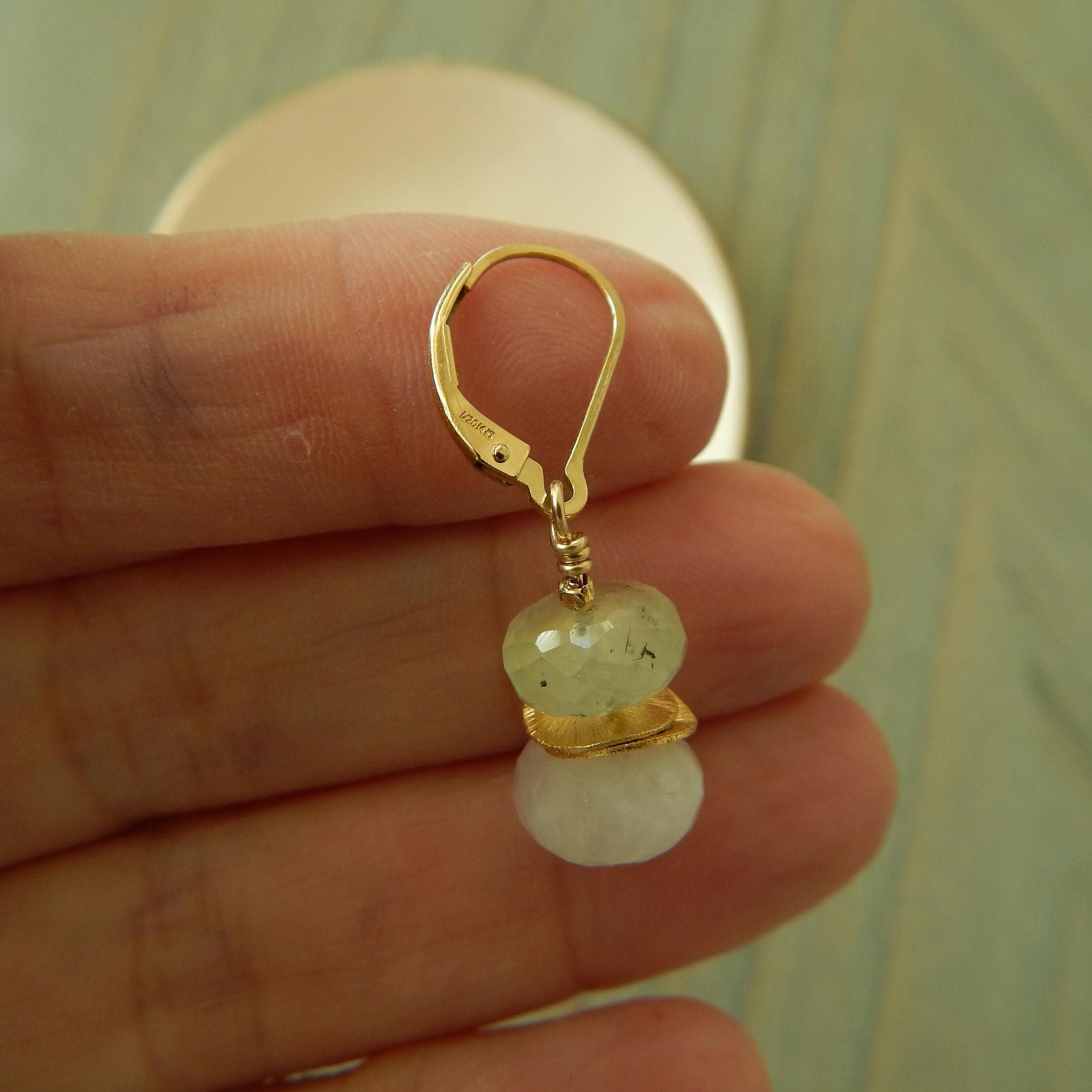 Faceted moonstone and prehnite rondelles are accented with gold vermeil wavy spacers dangle form 14kt gold filled leverbacks. Perfect for spring and summer months.