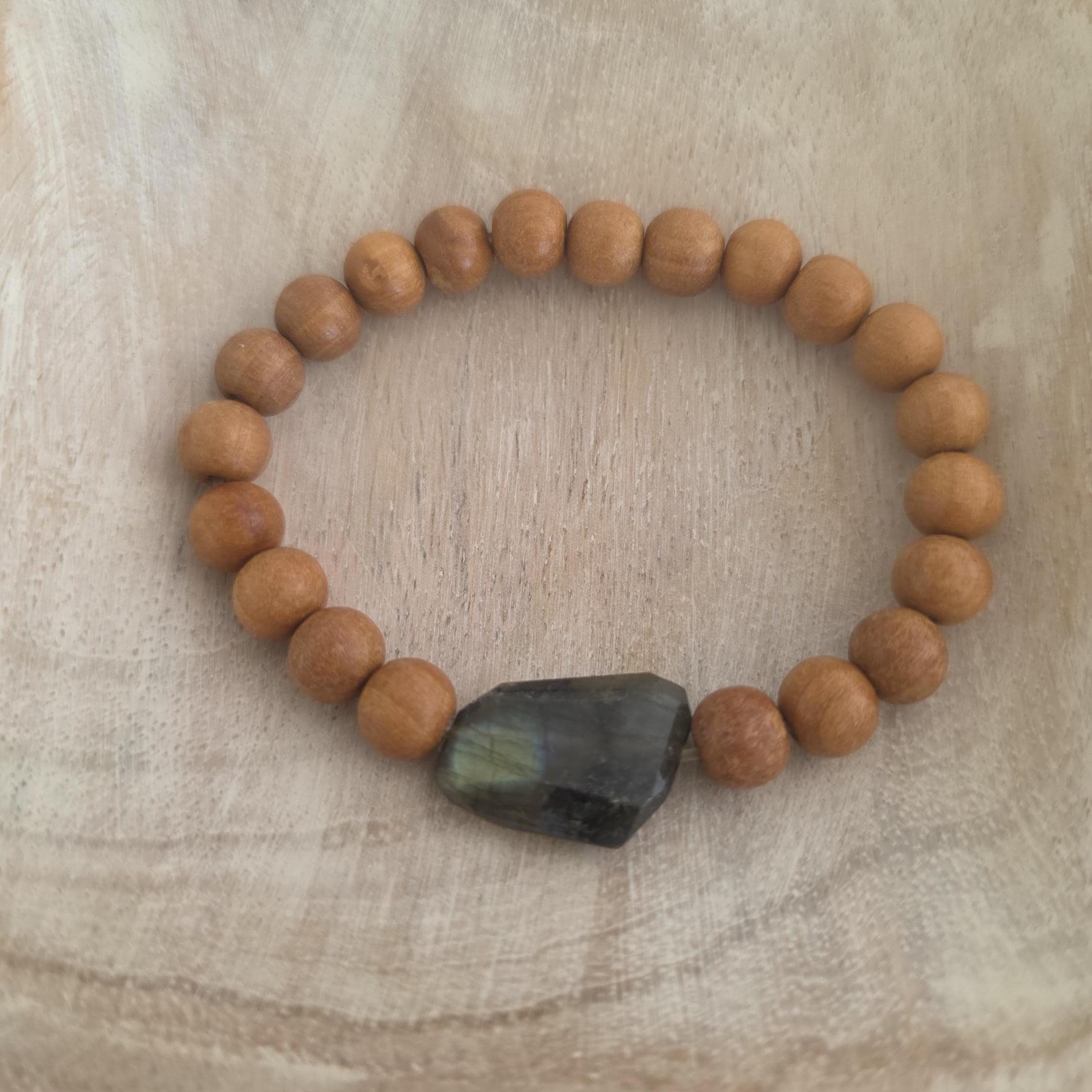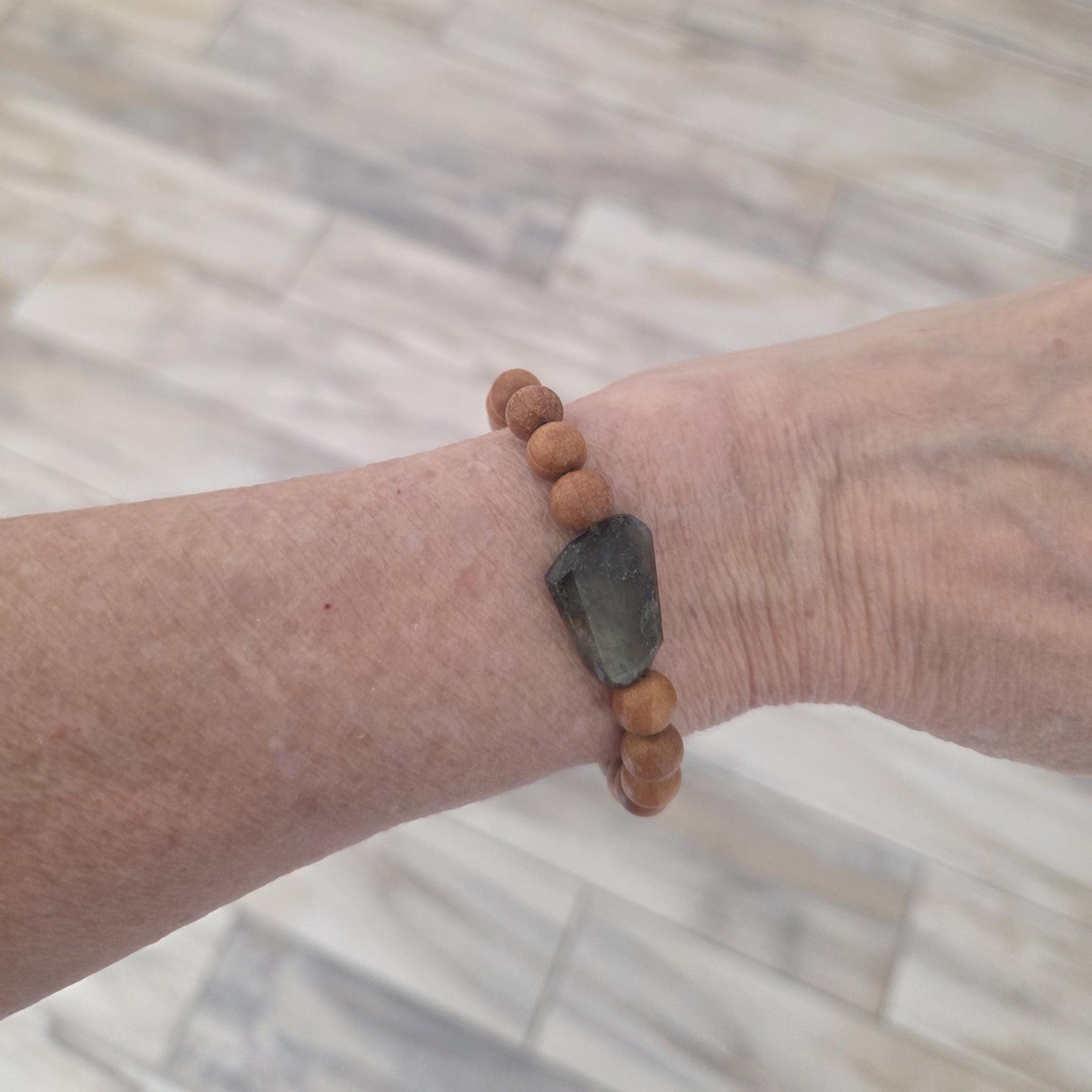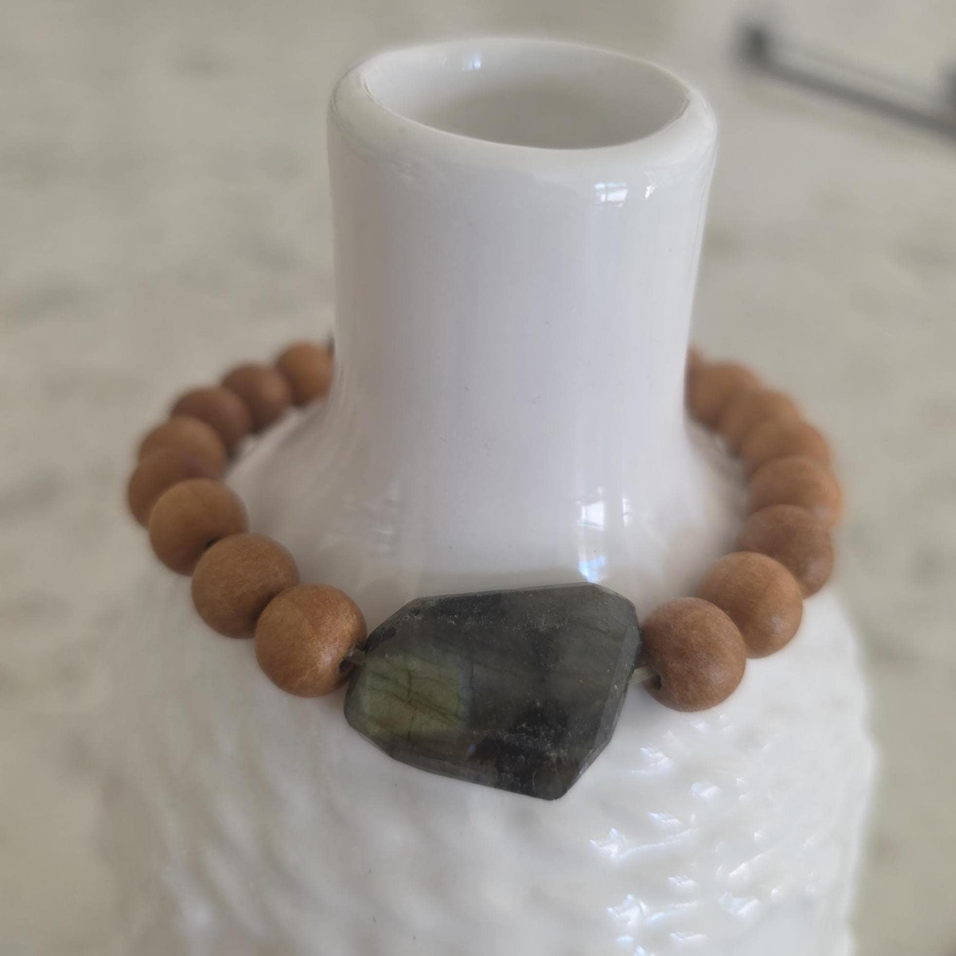This bracelet is made with scented sandalwood and a beautiful labradorite slab. Wear this bracelet alone or stack with others from my shop.