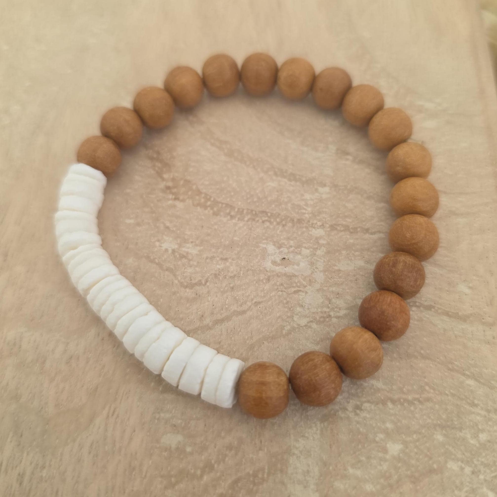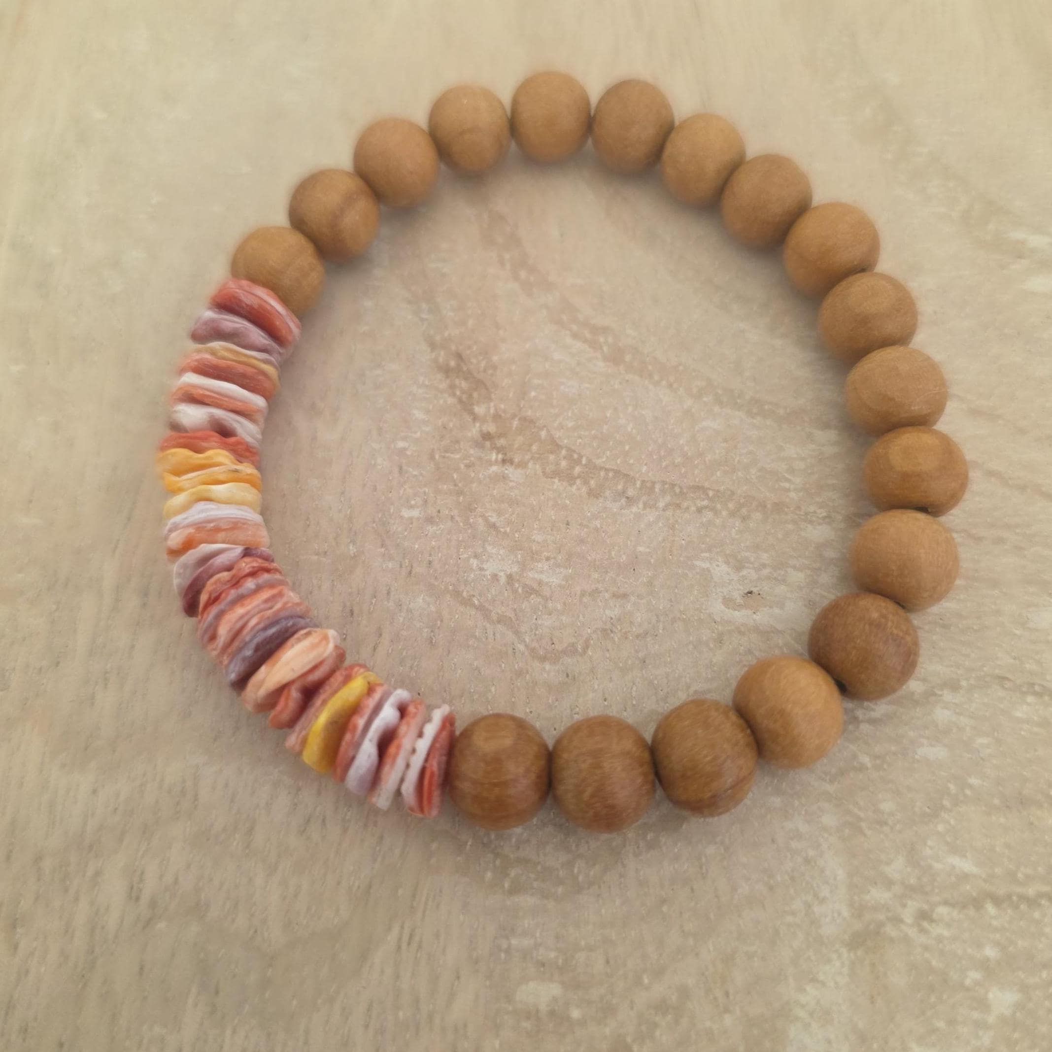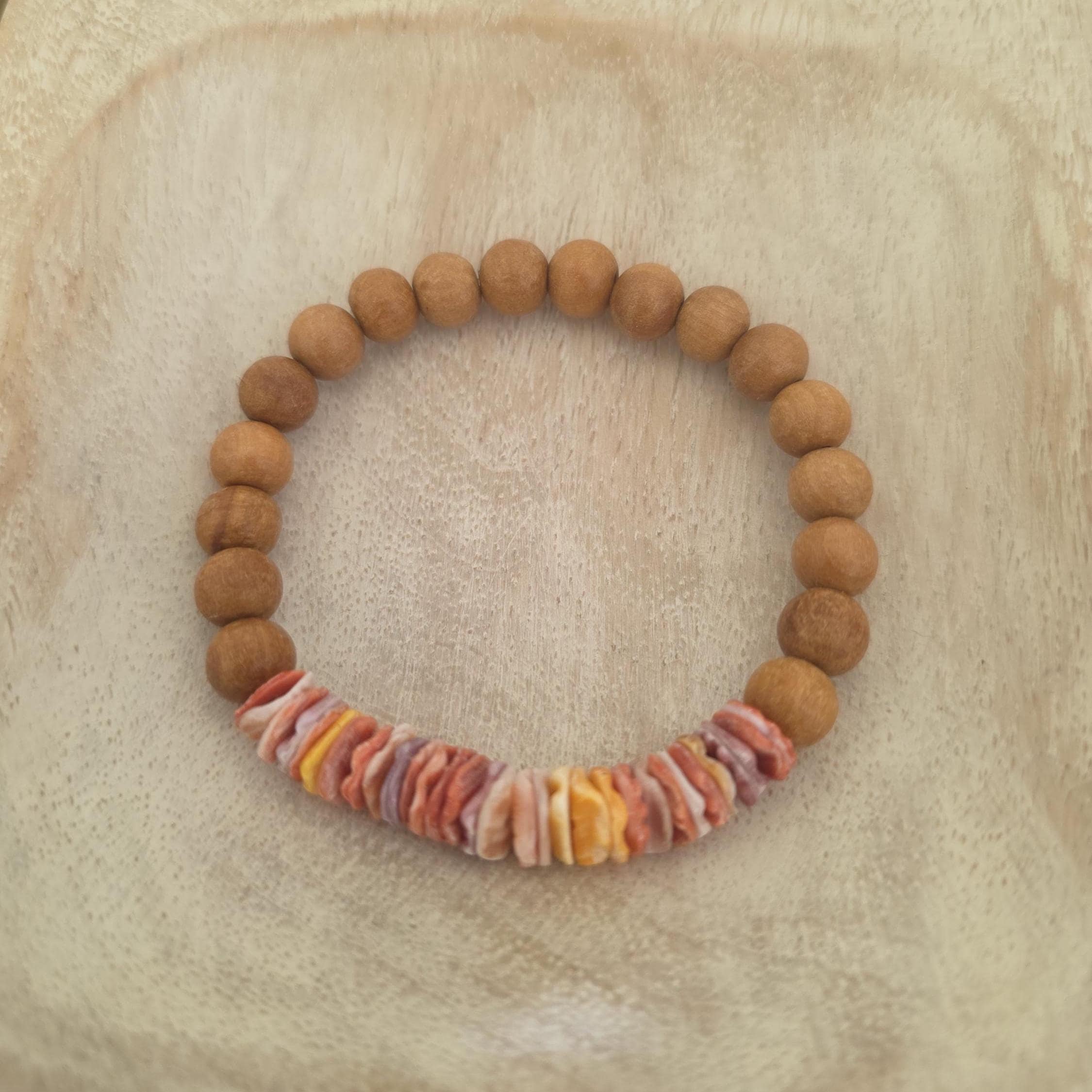 Sandalwood and heishi pectin shell bracelet, colorful shell beads