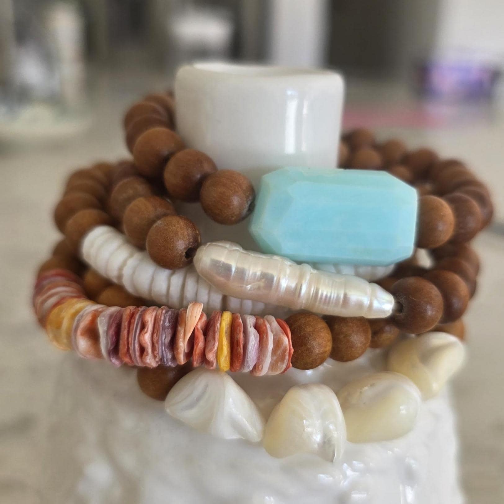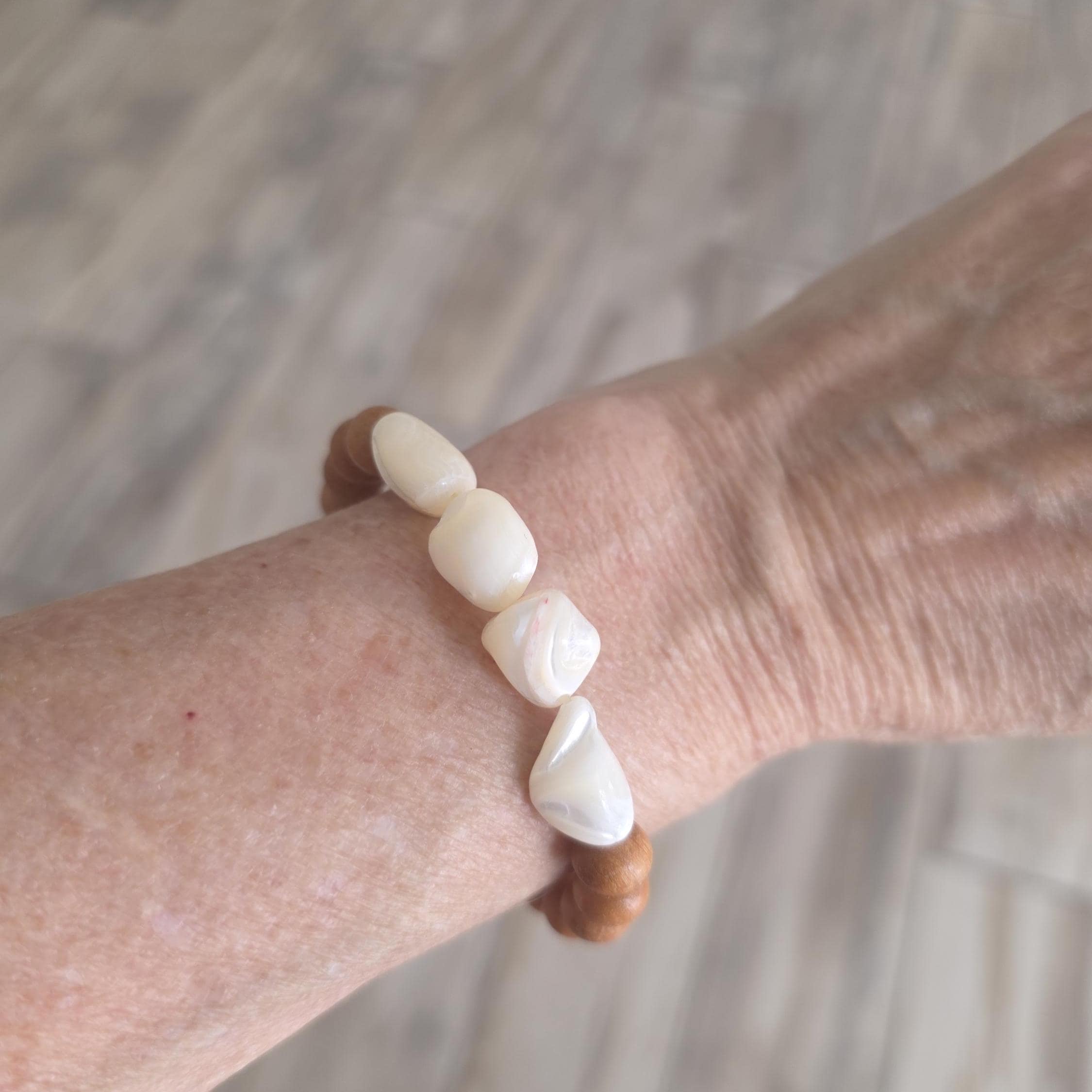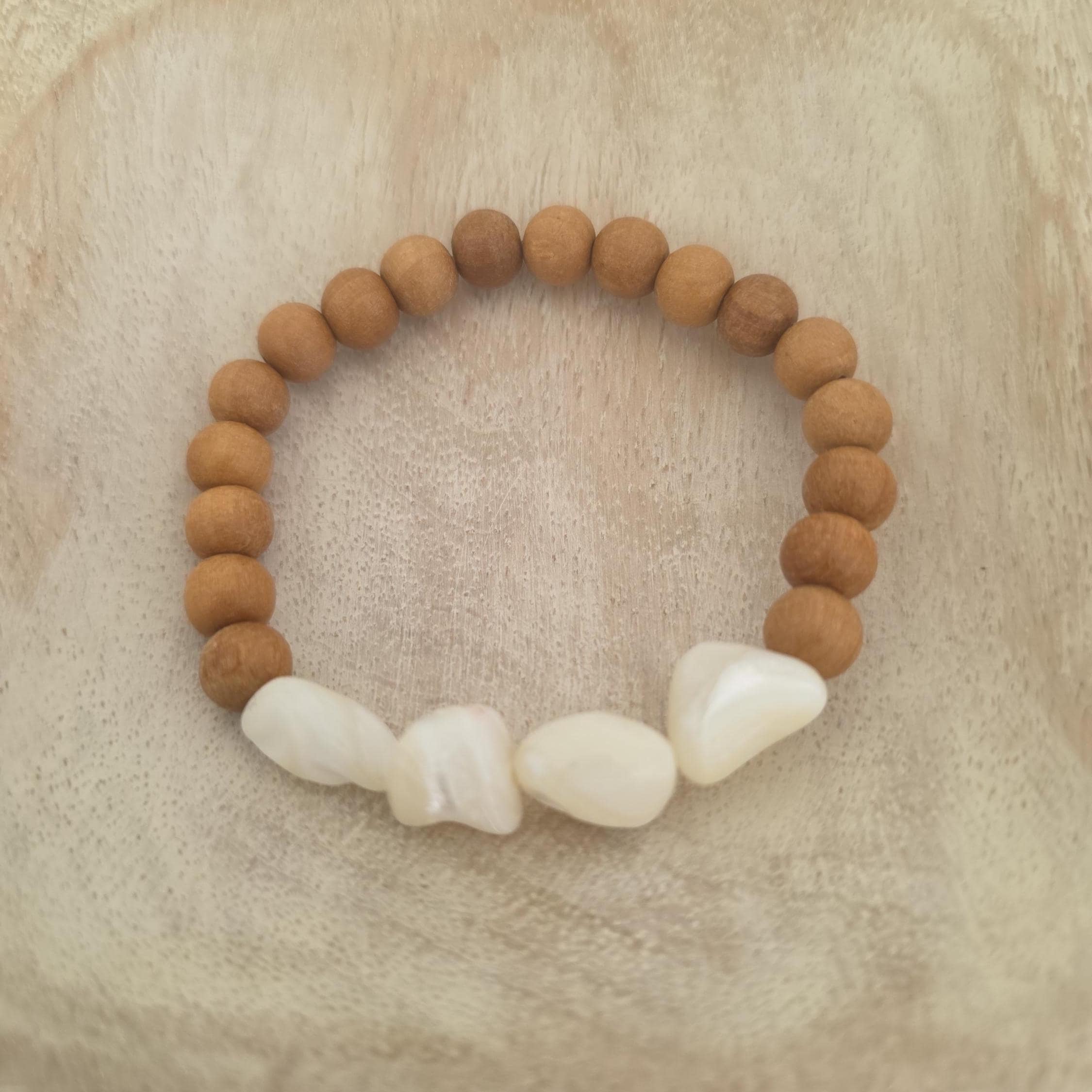 Sandalwood and heishi pectin shell bracelet, colorful shell beads