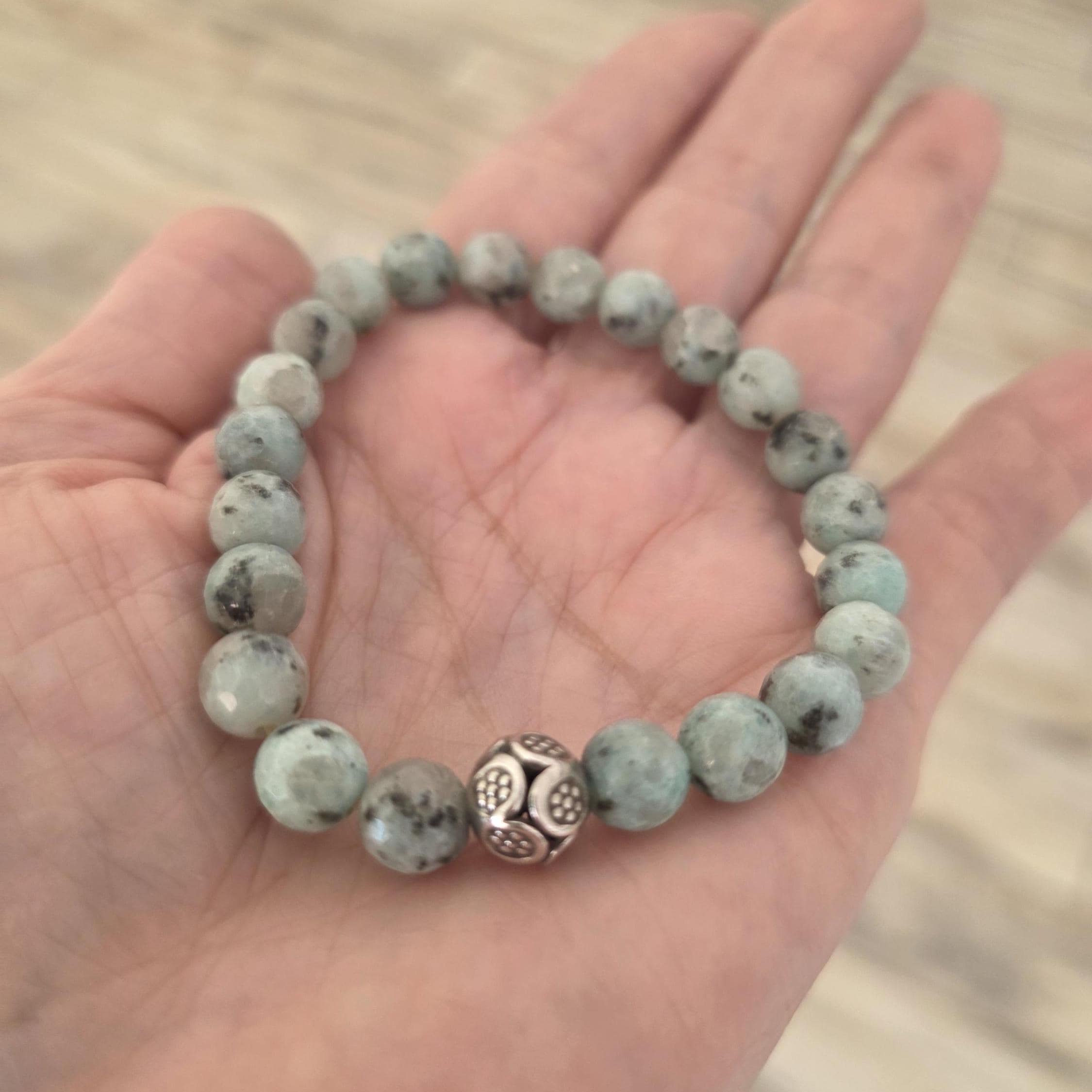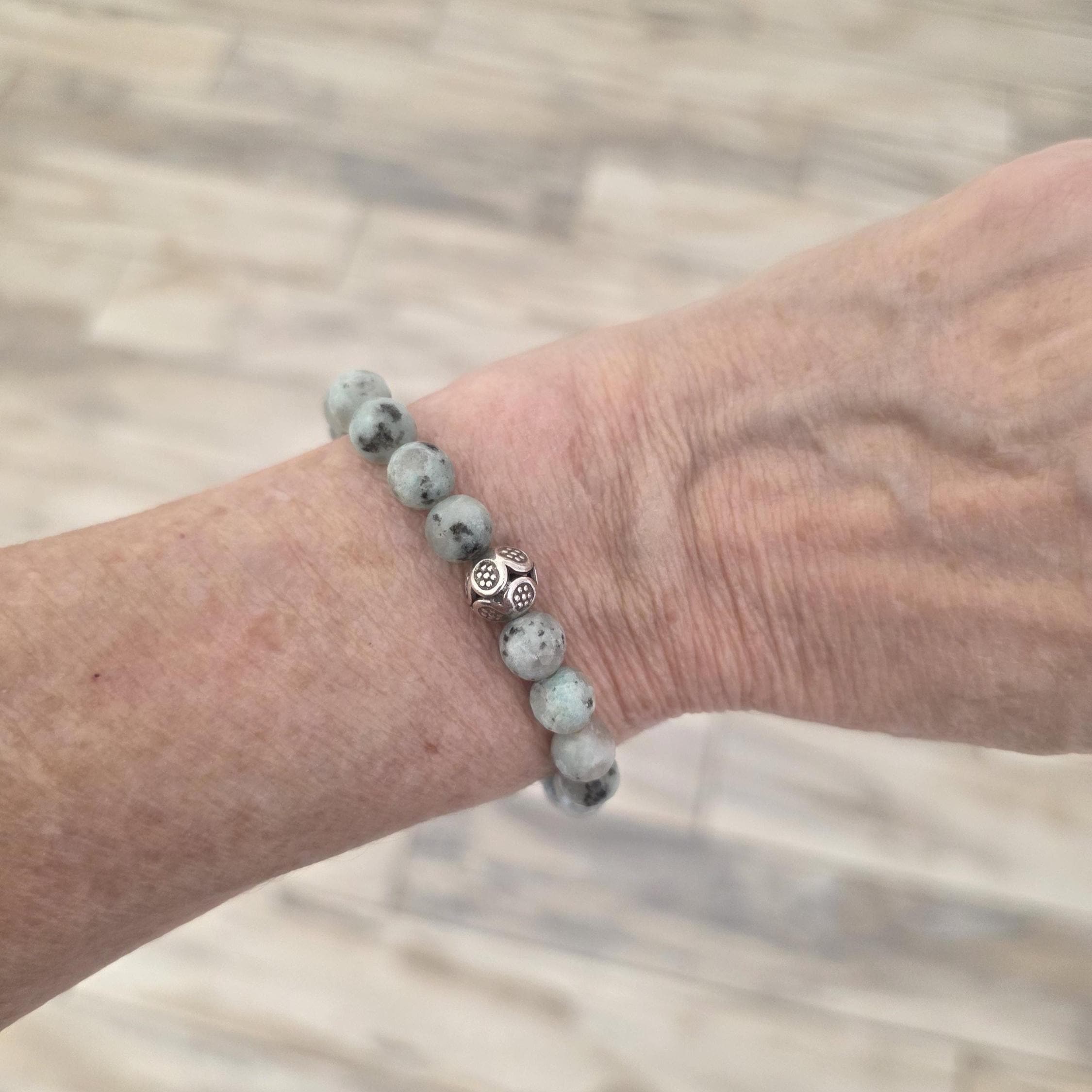 Kiwi jasper stretch bracelet with sterling silver hill tribe bead