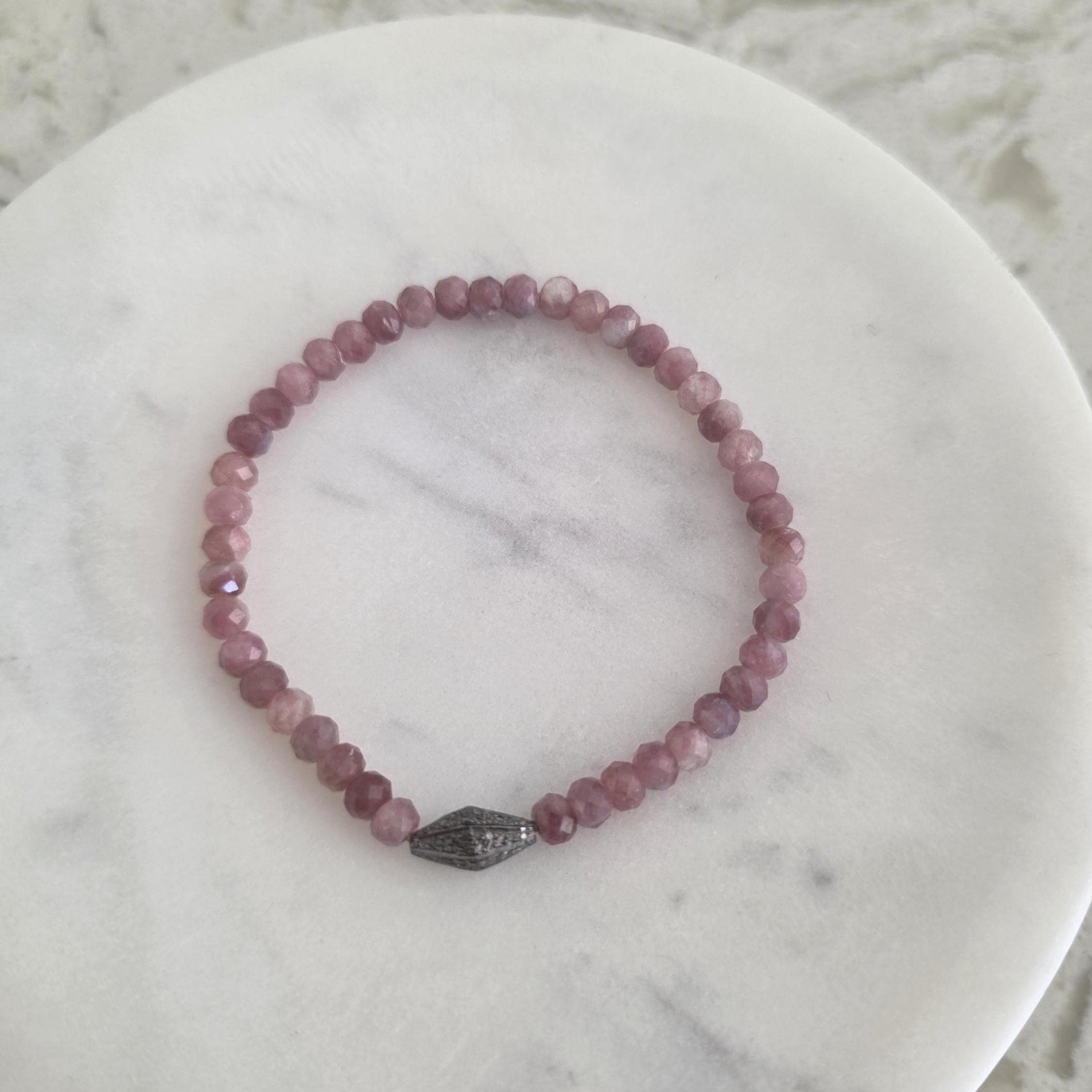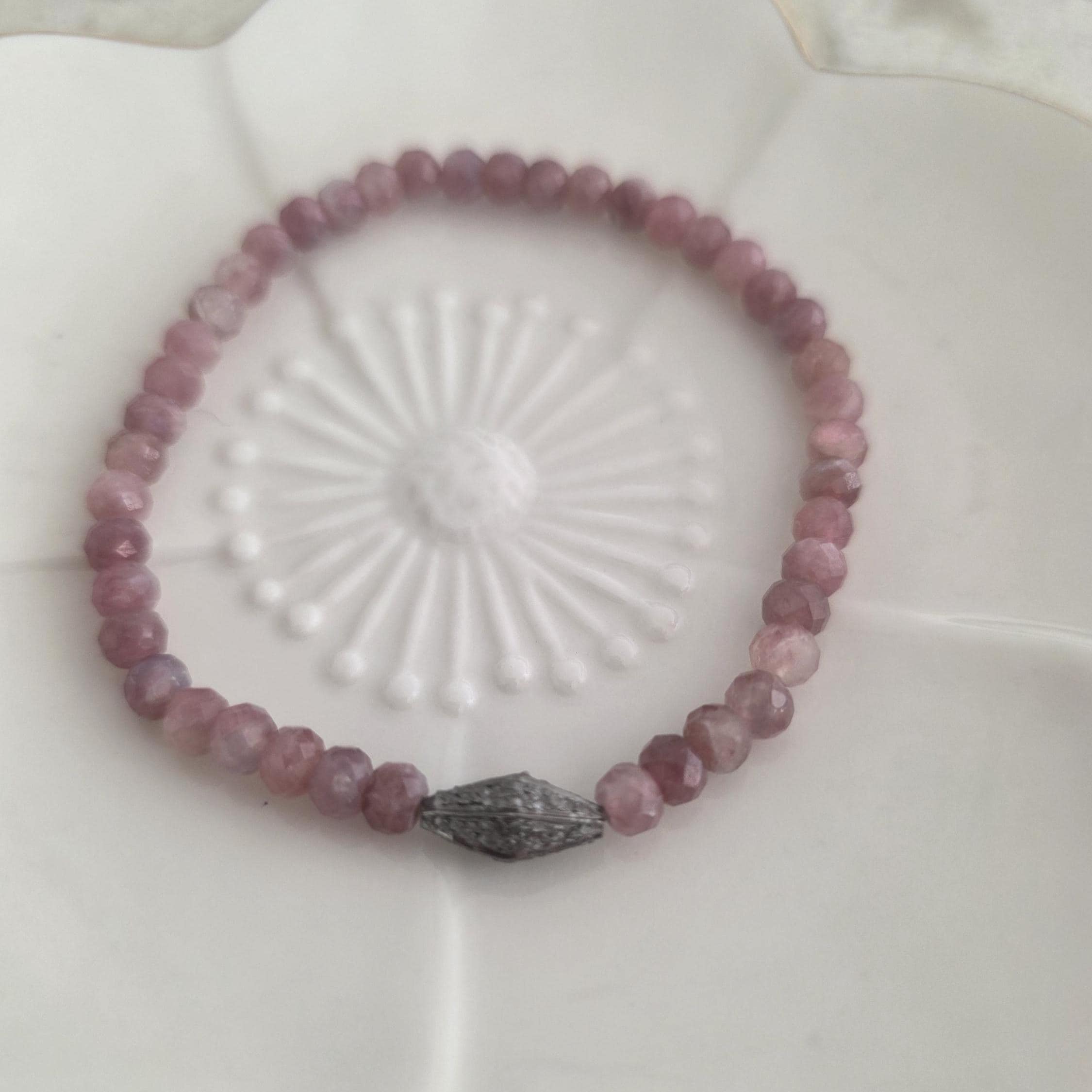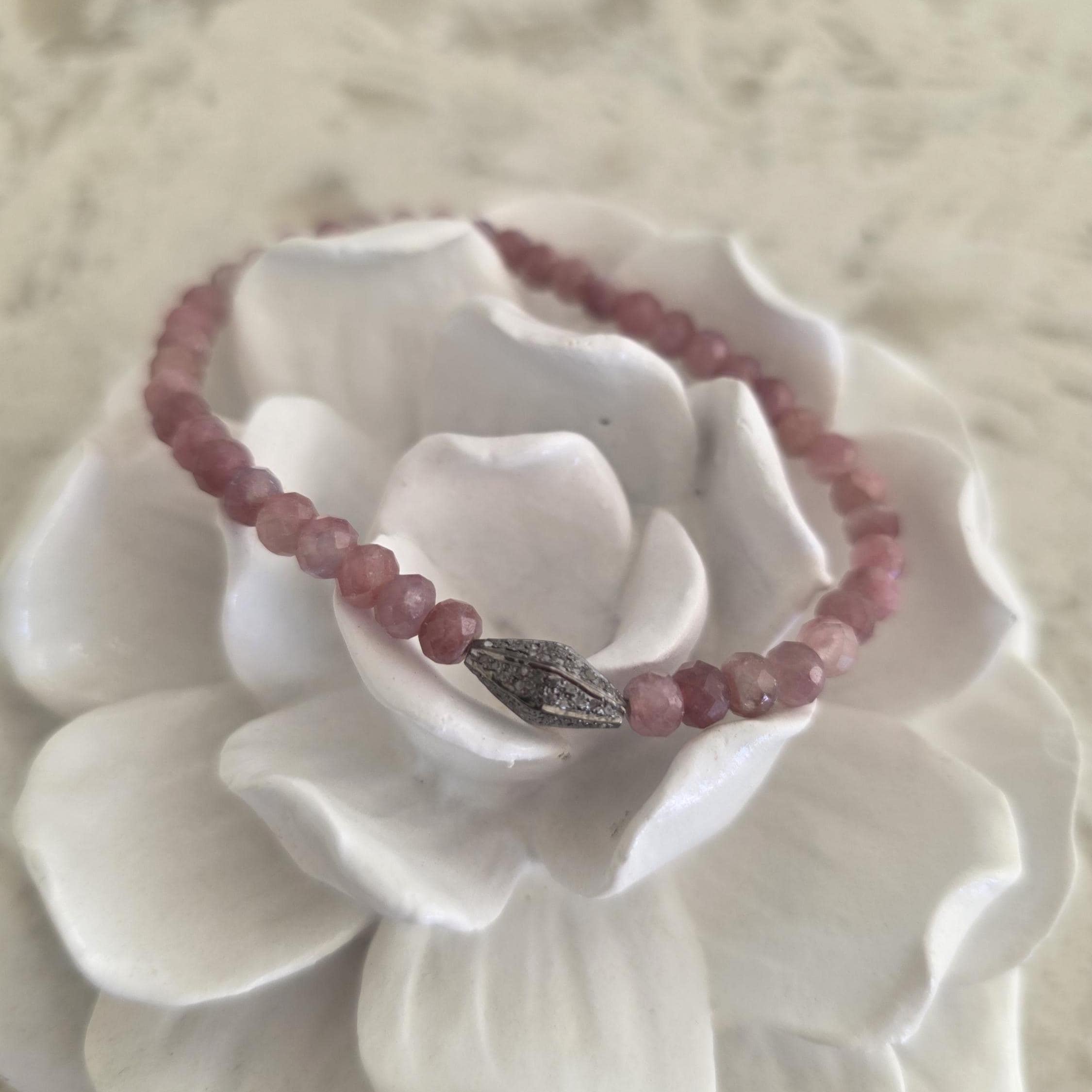 Dainty faceted dark pink tourmaline bracelet holds a sterling silver pave diamond bicone bead. This bracelet is perfect for stacking and adds a boho vibe to any stack you are wearing. Wear alone for an elegant boho vibe.