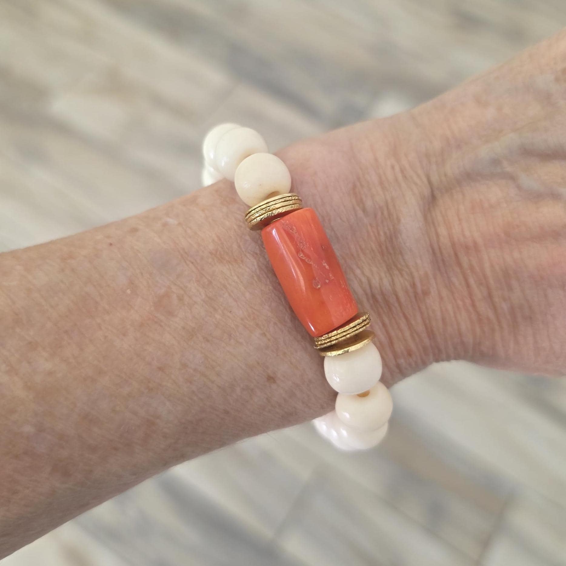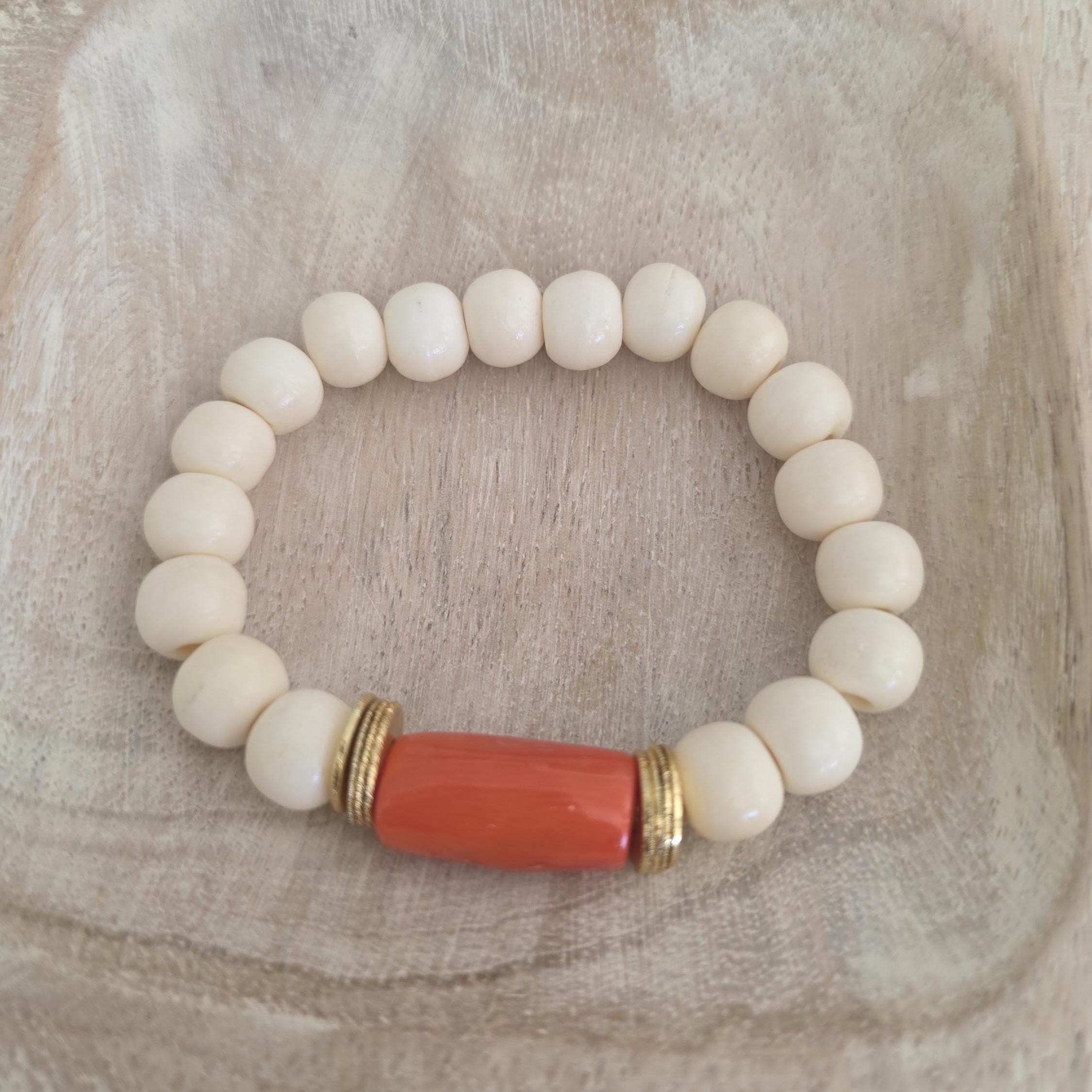 Creamy beige bone beads surround a coral tube bead accented with gold plated spacers. Wear alone or stack with others for a summer boho vibe.