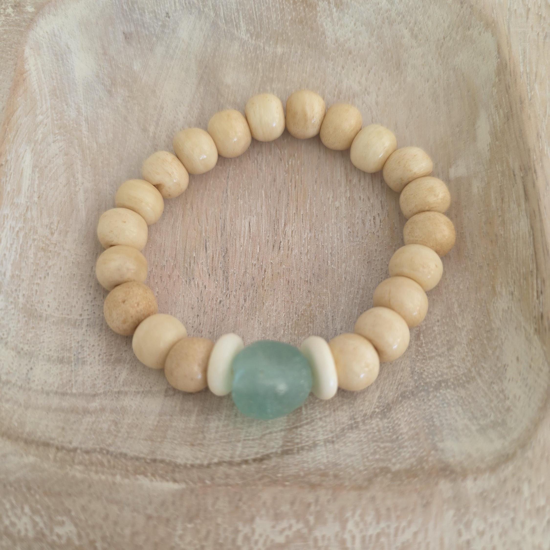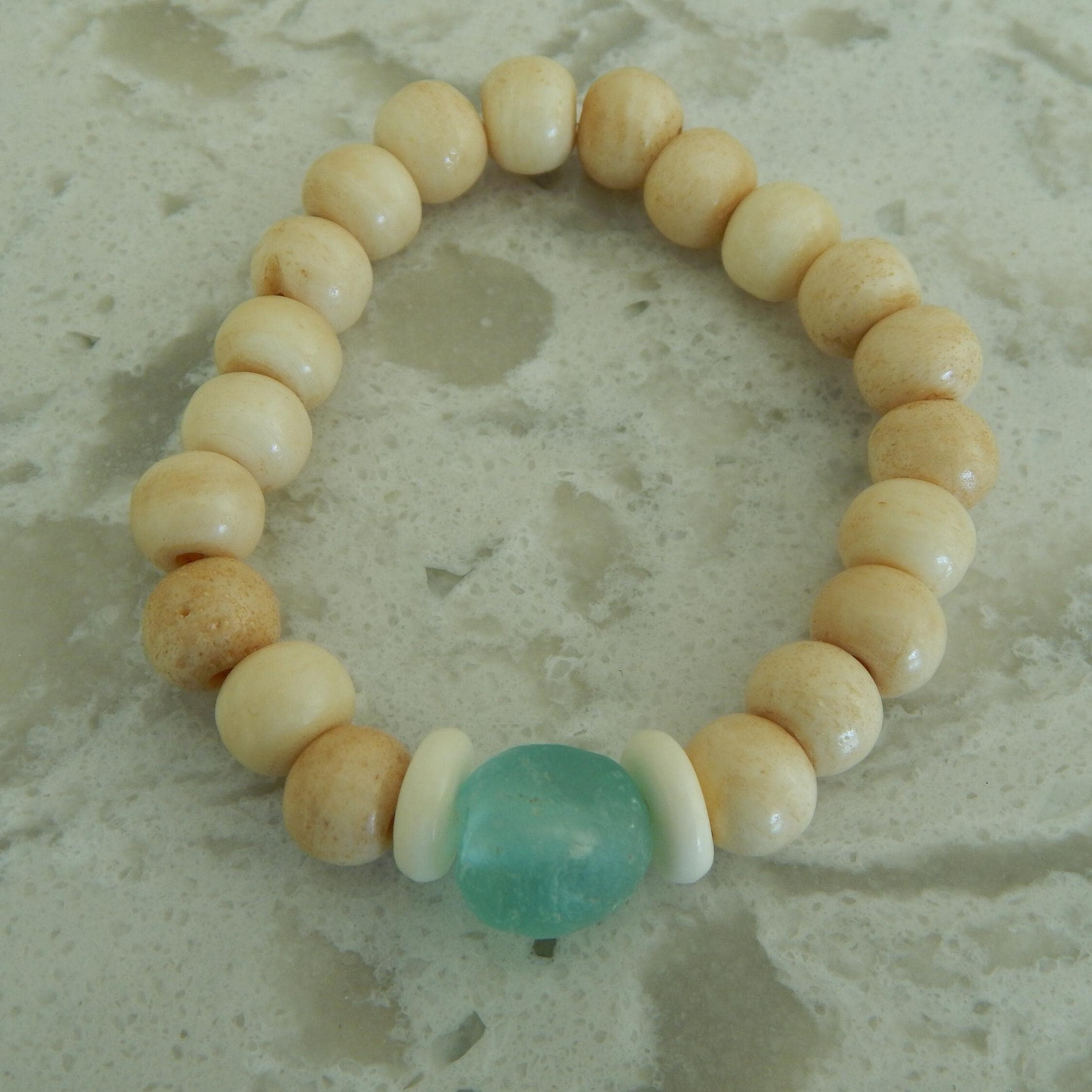 Beige bone beads surround an aqua blue seaglass bead. Wear alone or stack with others for a summer boho vibe.