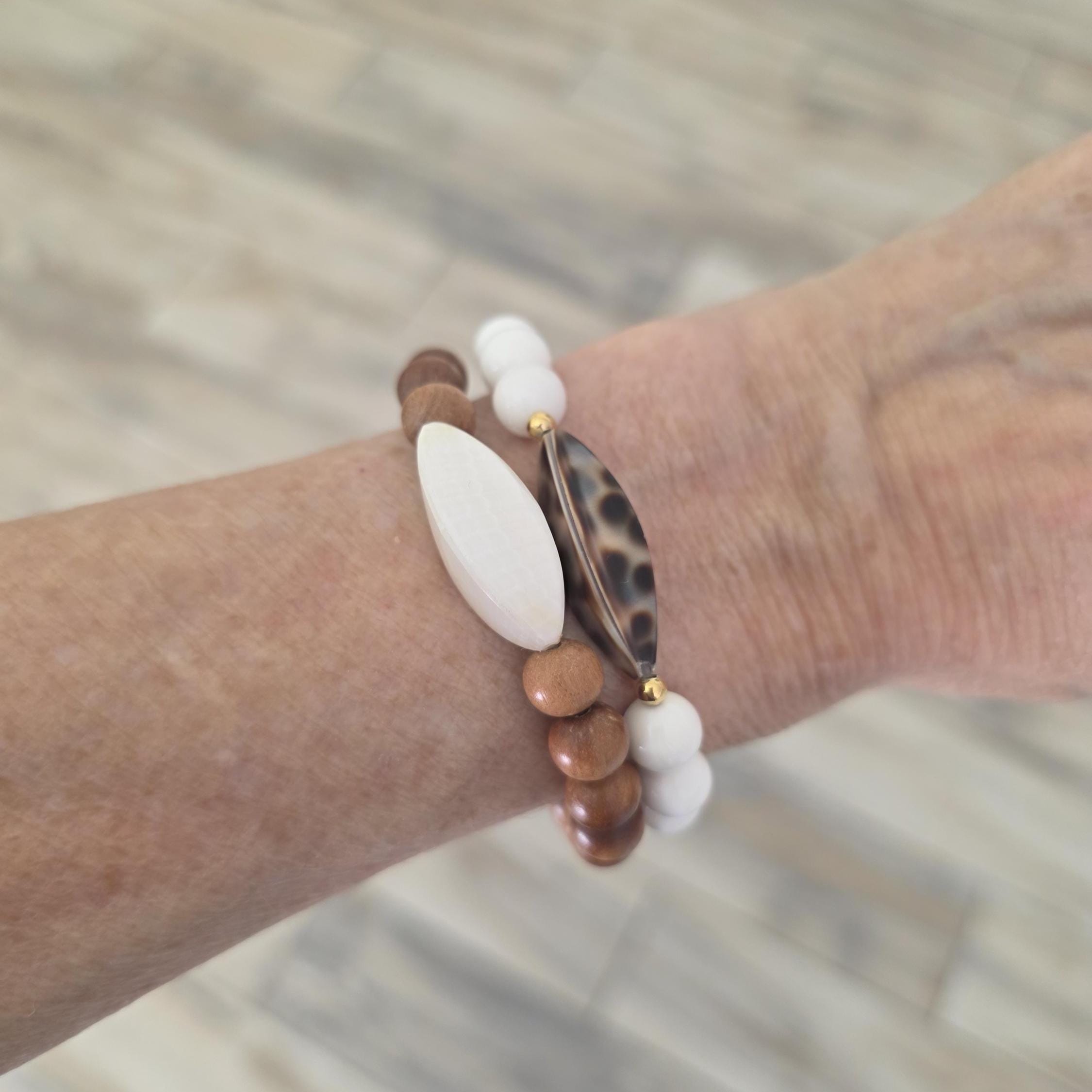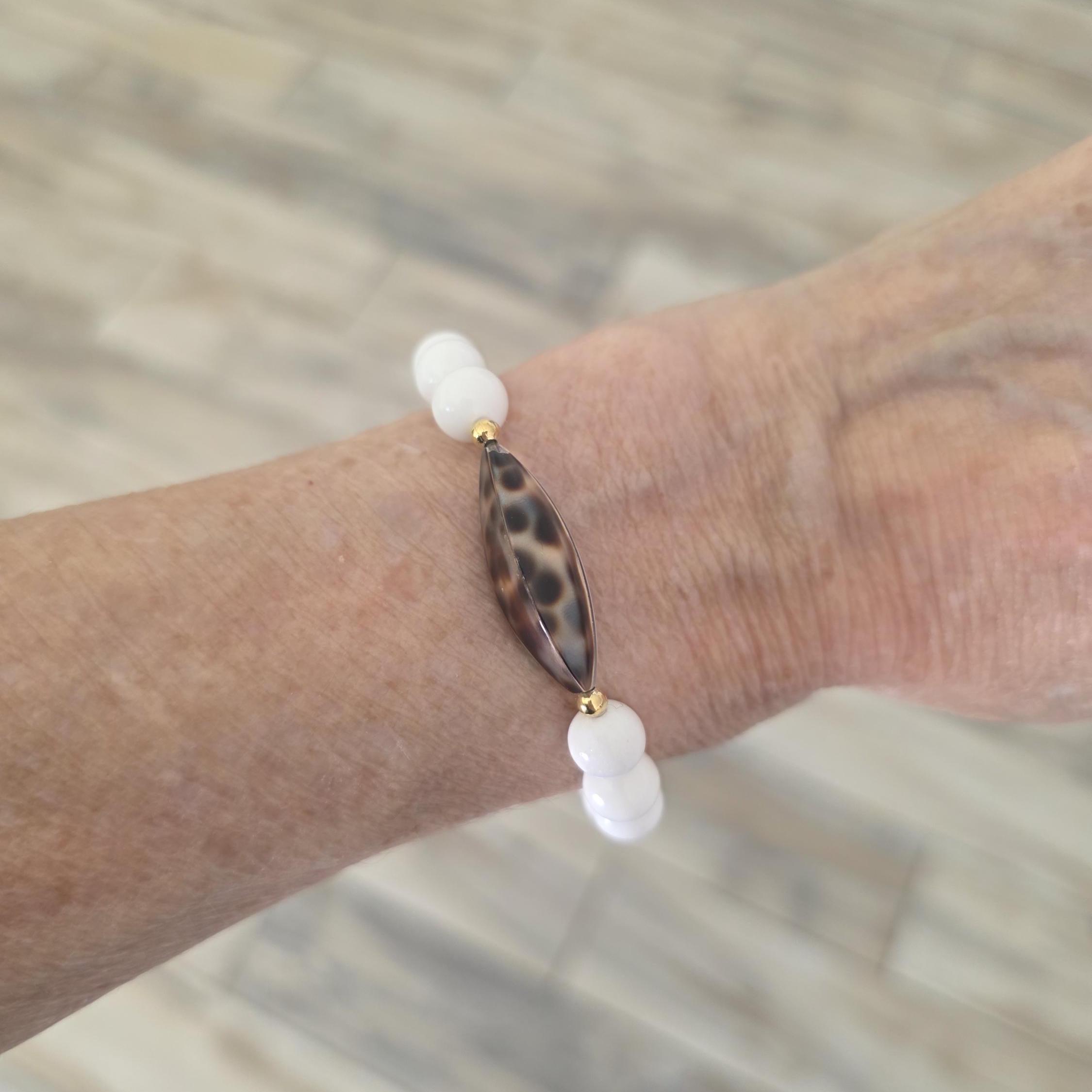 This bracelet is made with white shell beads and a four sided cowry shell bead. Wear this bracelet alone or stack with others from my shop.