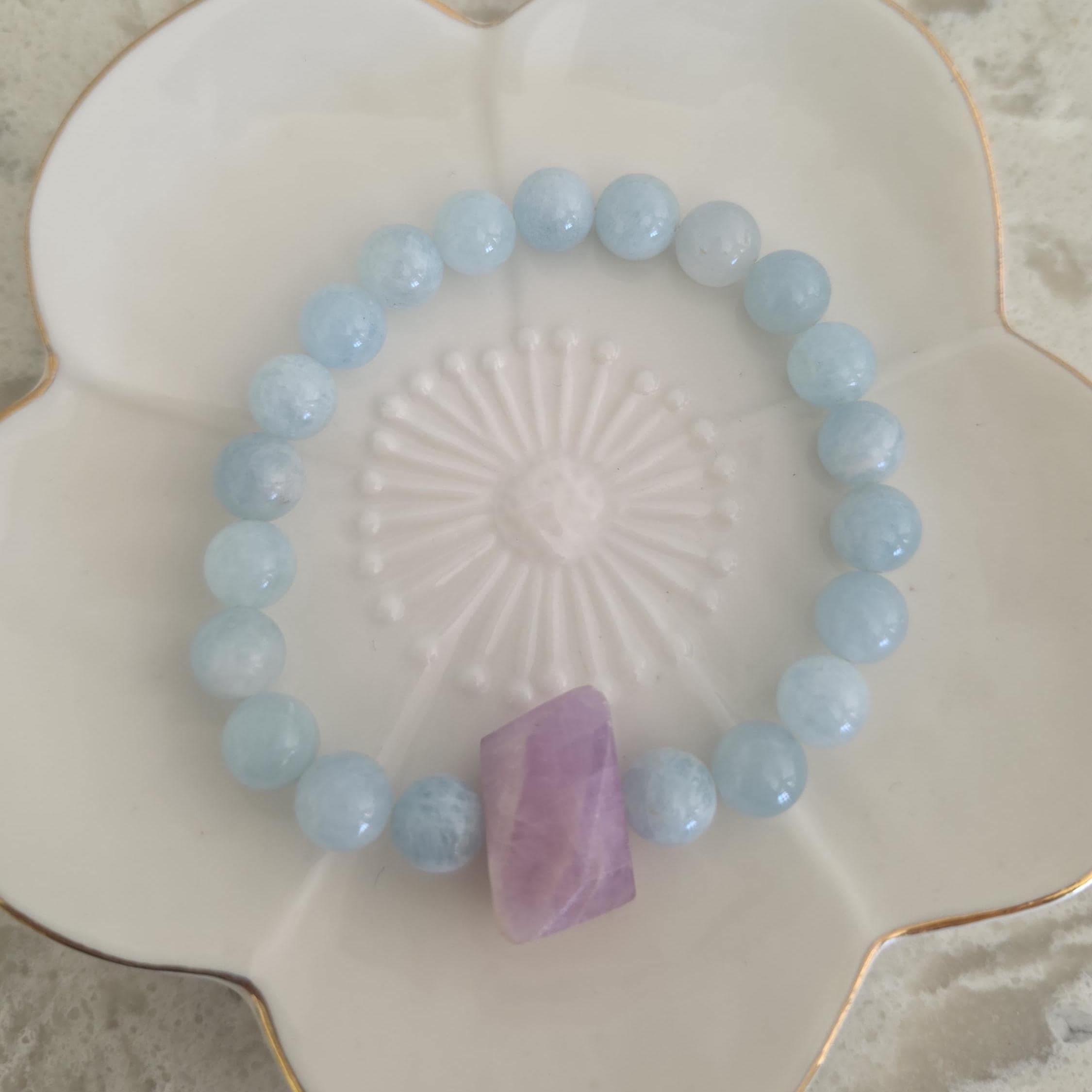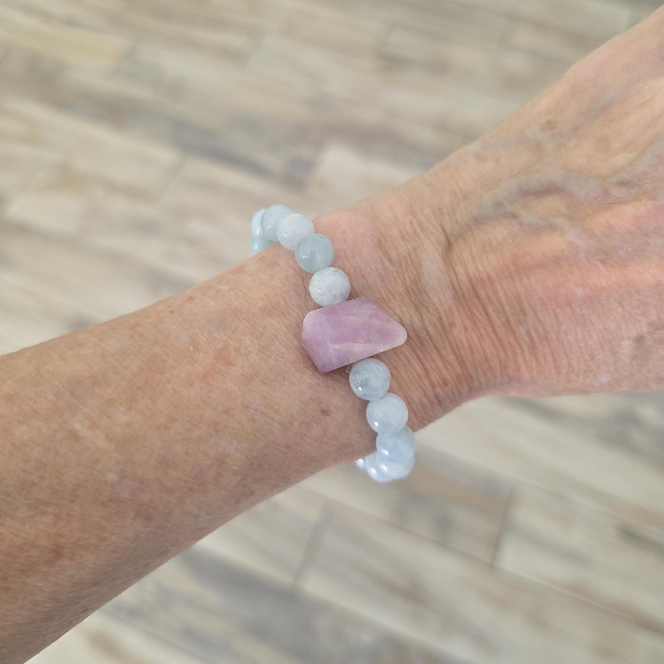 Gorgeous aquamarine beads surround a lavender kunzite nugget bead. Wear alone or stack with others for a boho organic look.