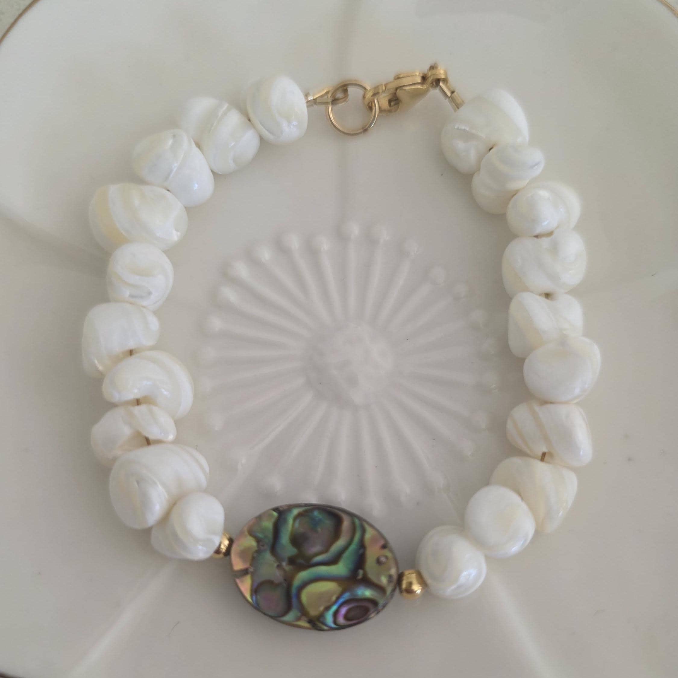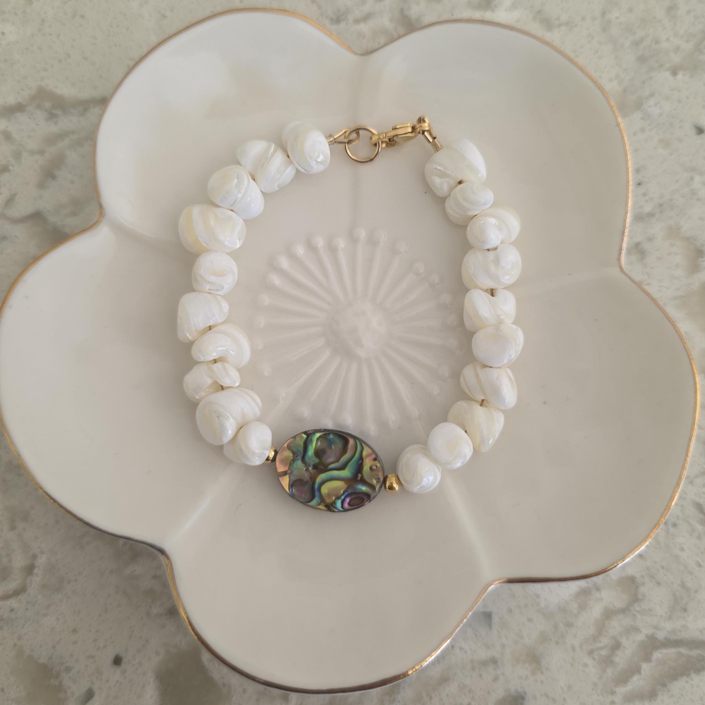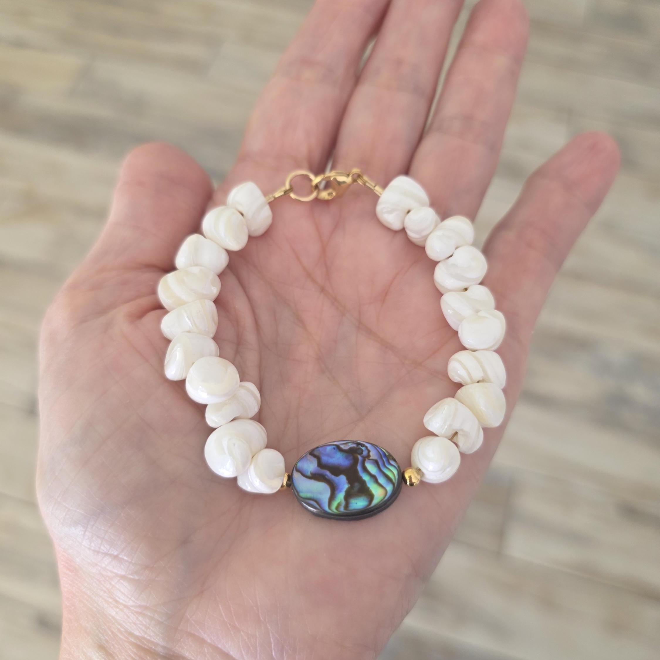 White troca shell nugget beads with an abalone center bead lend this bracelet its beach boho vibe. Lightweight and natural-looking, it’s easy to wear every day and pairs well with casual or beachy outfits.