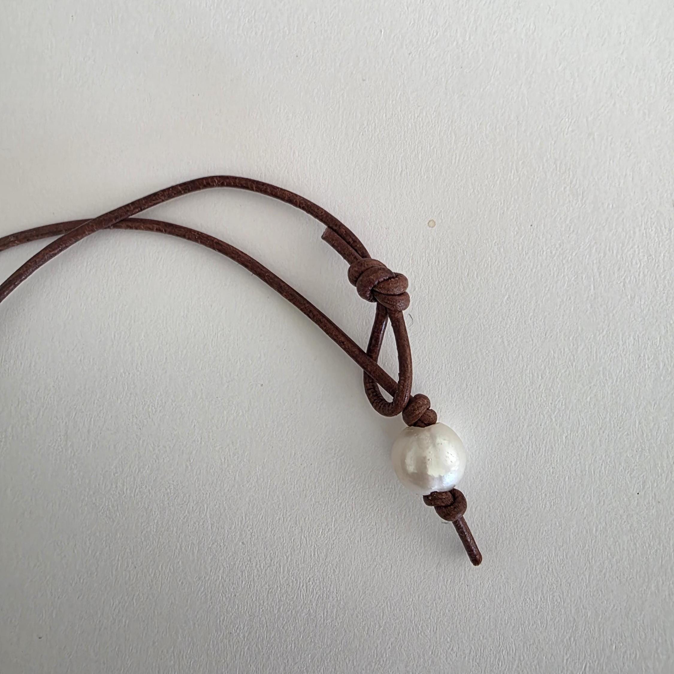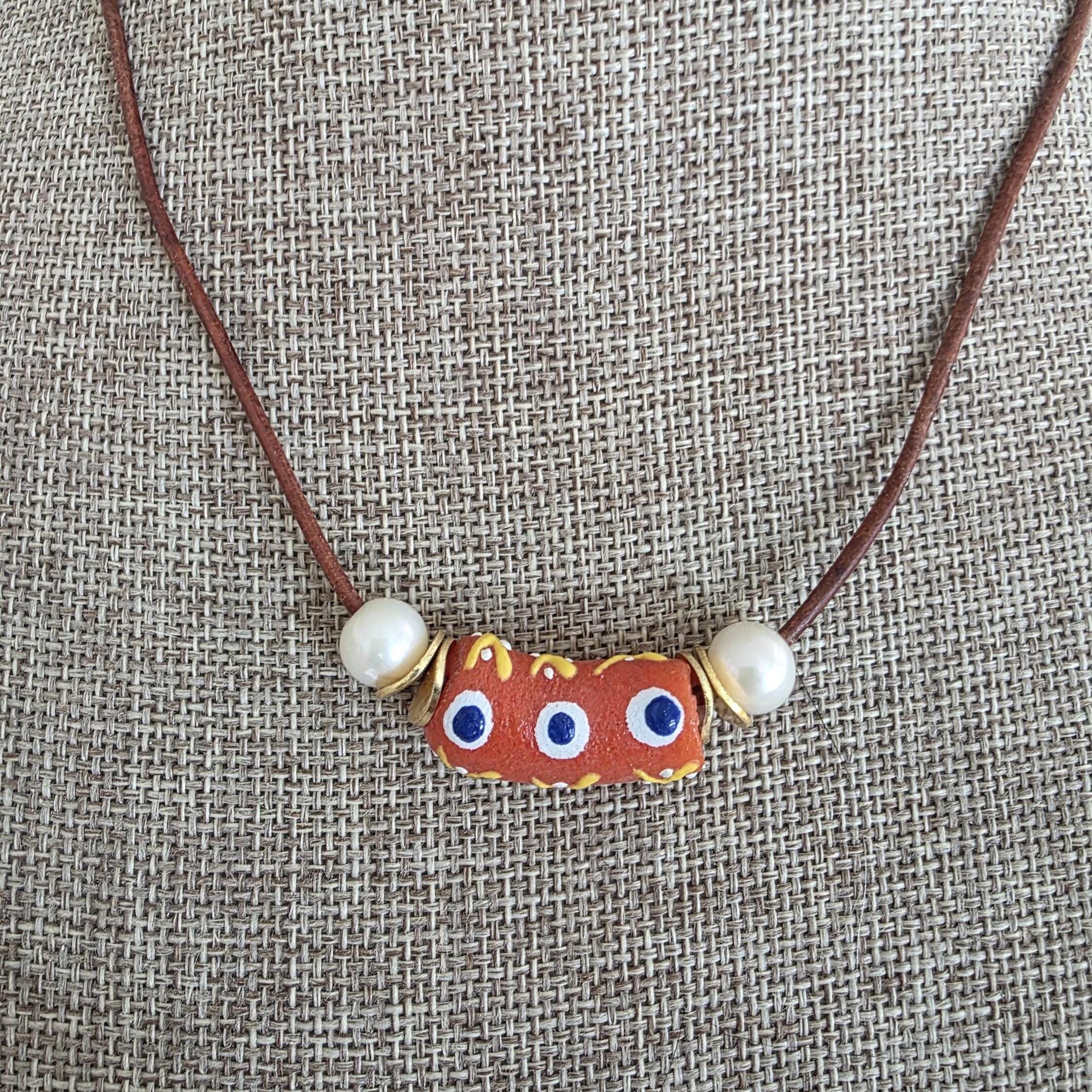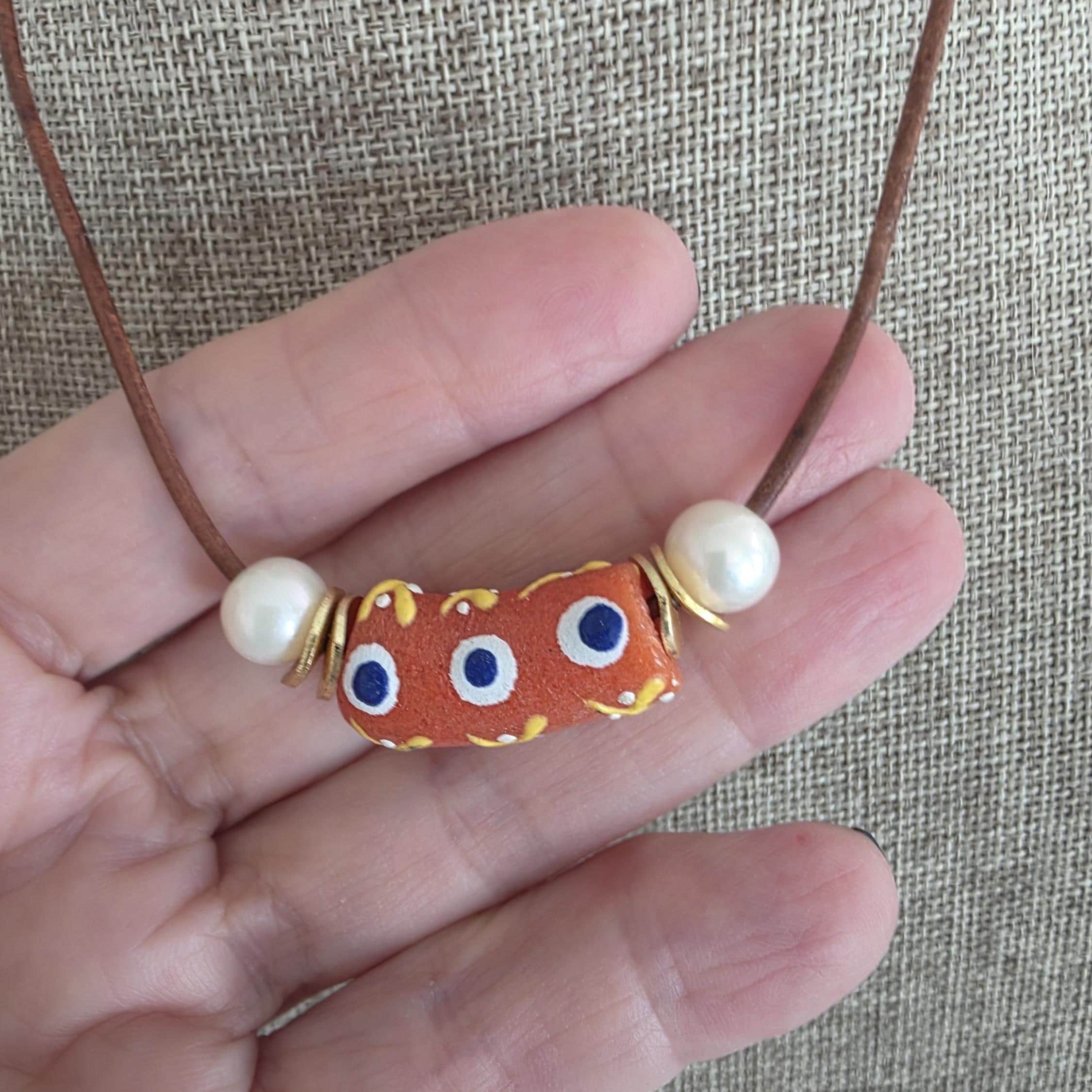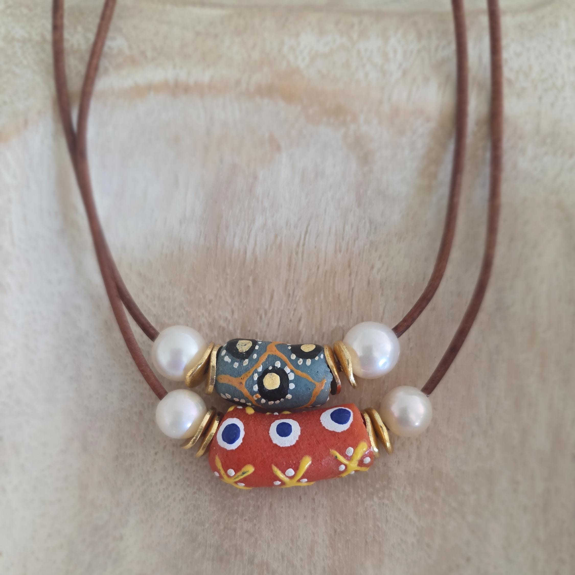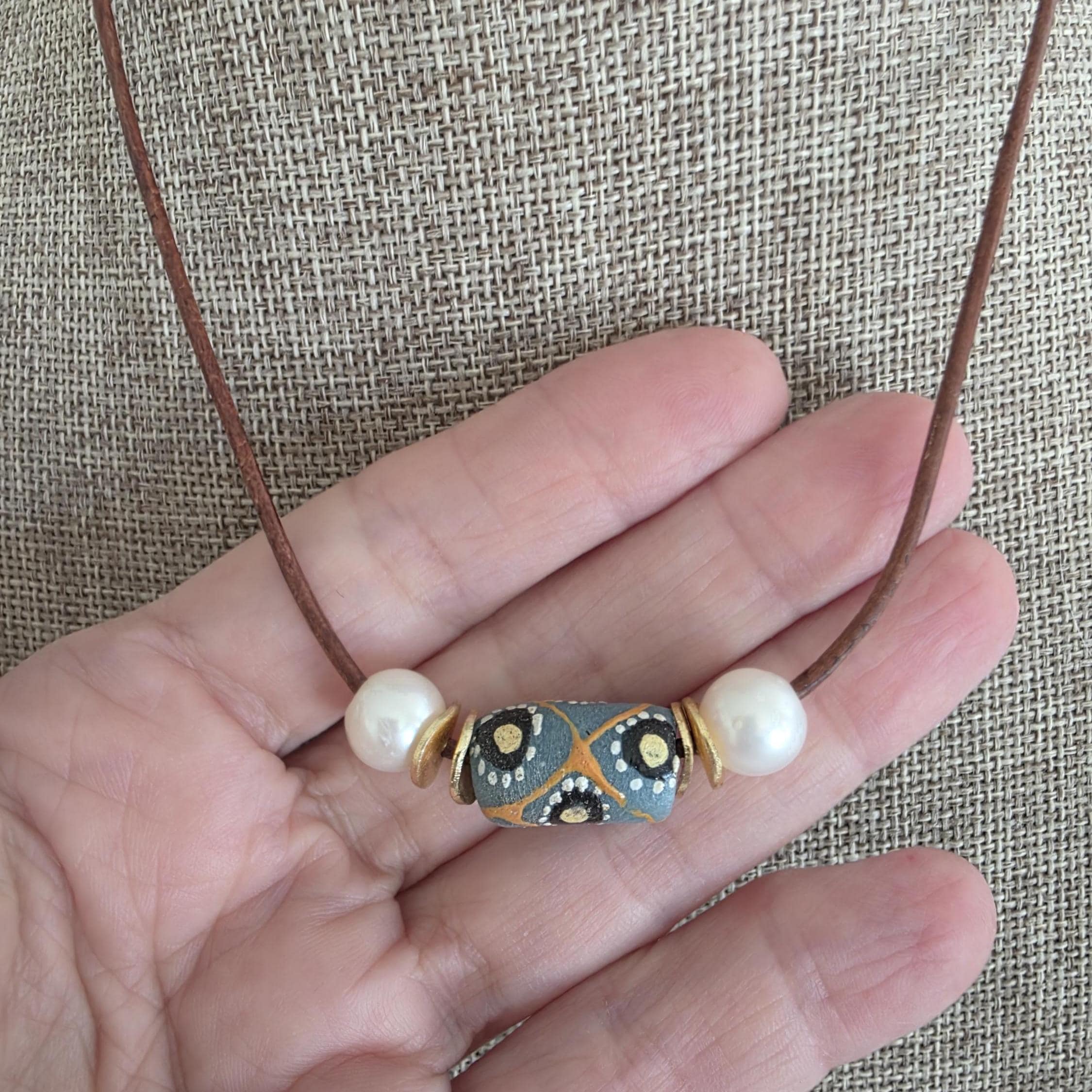 An African krobo bead is surrounded by freshwater pearls and gold plated spacers strung on greek leather cord. This simple necklace can be worn alone or layered with other necklaces for a boho vibe.