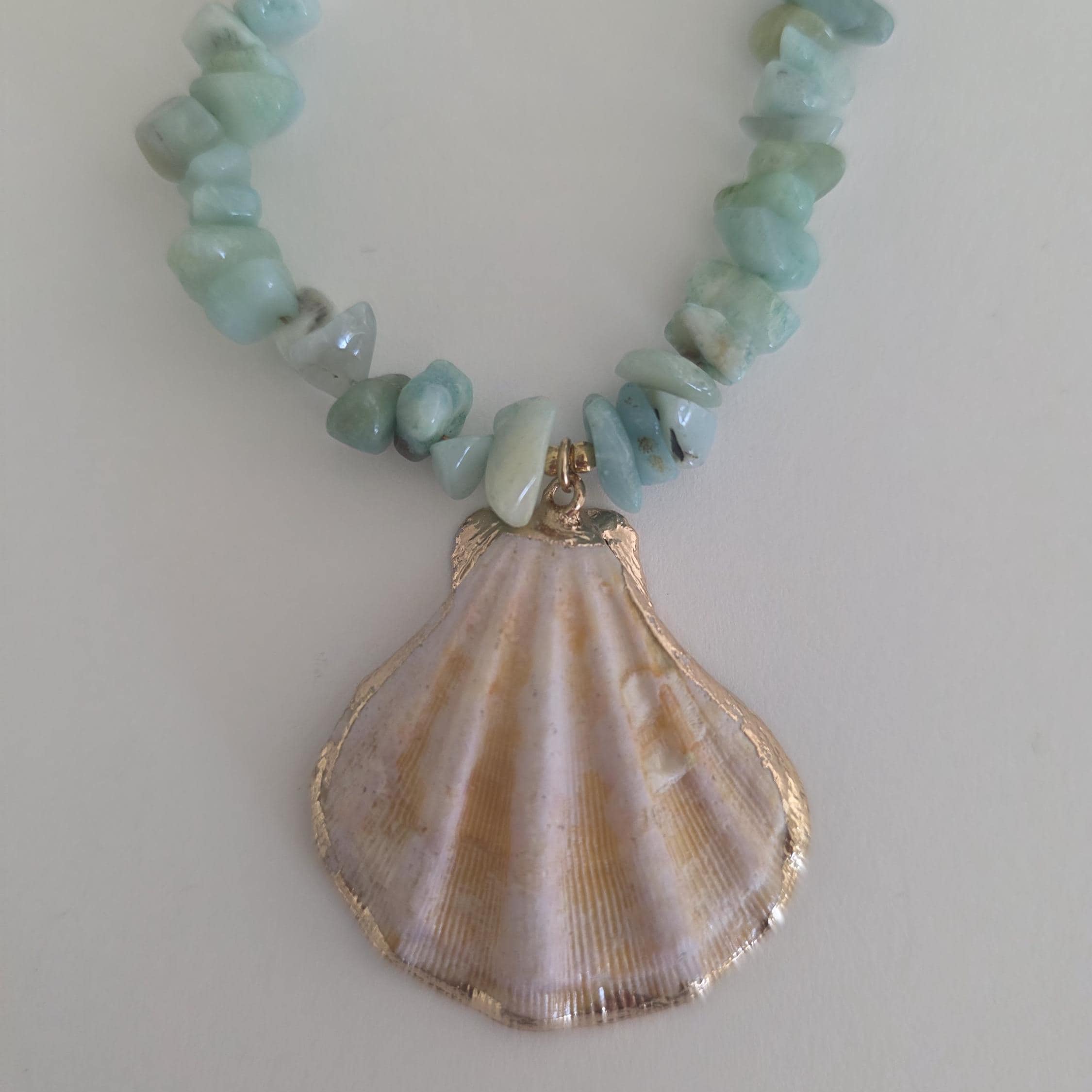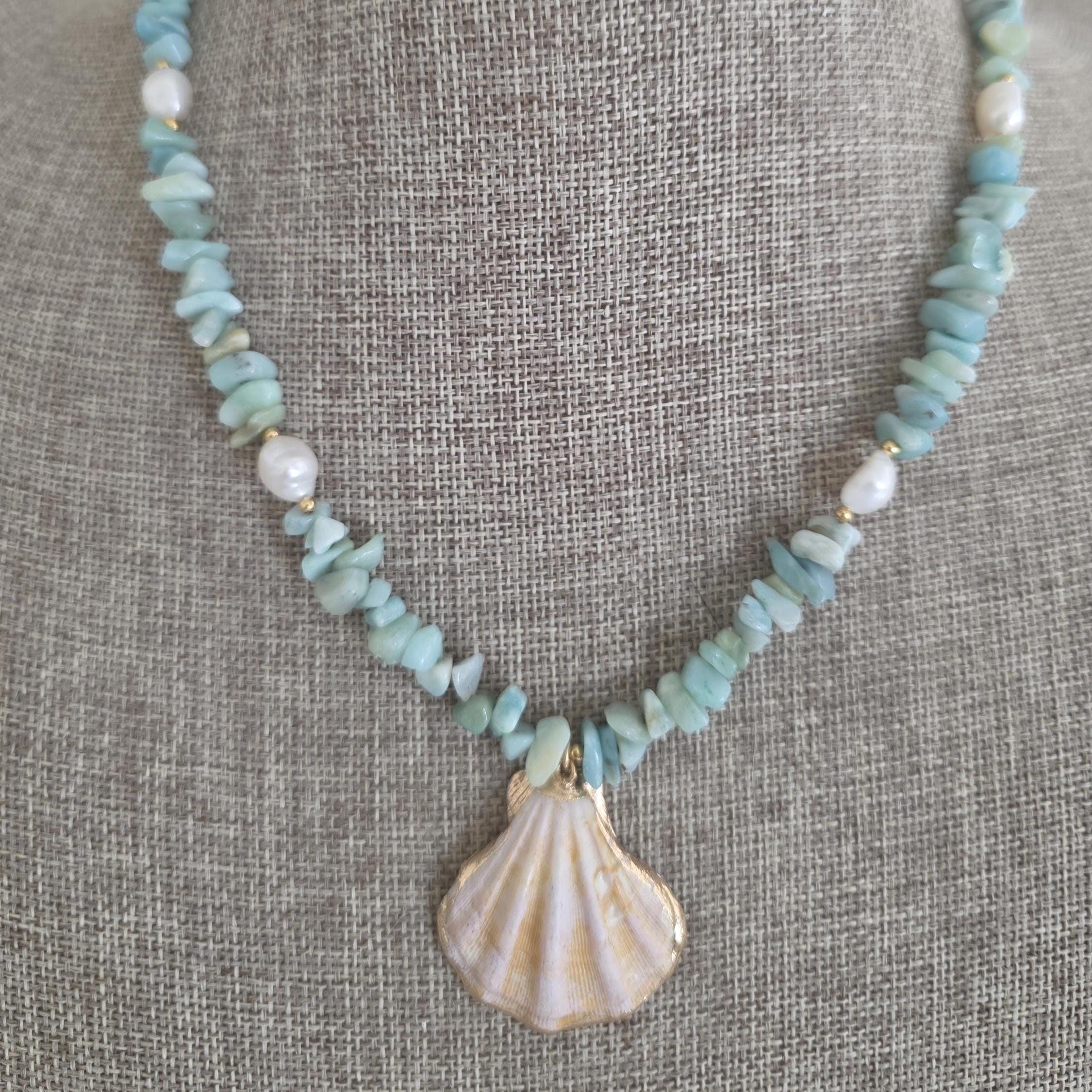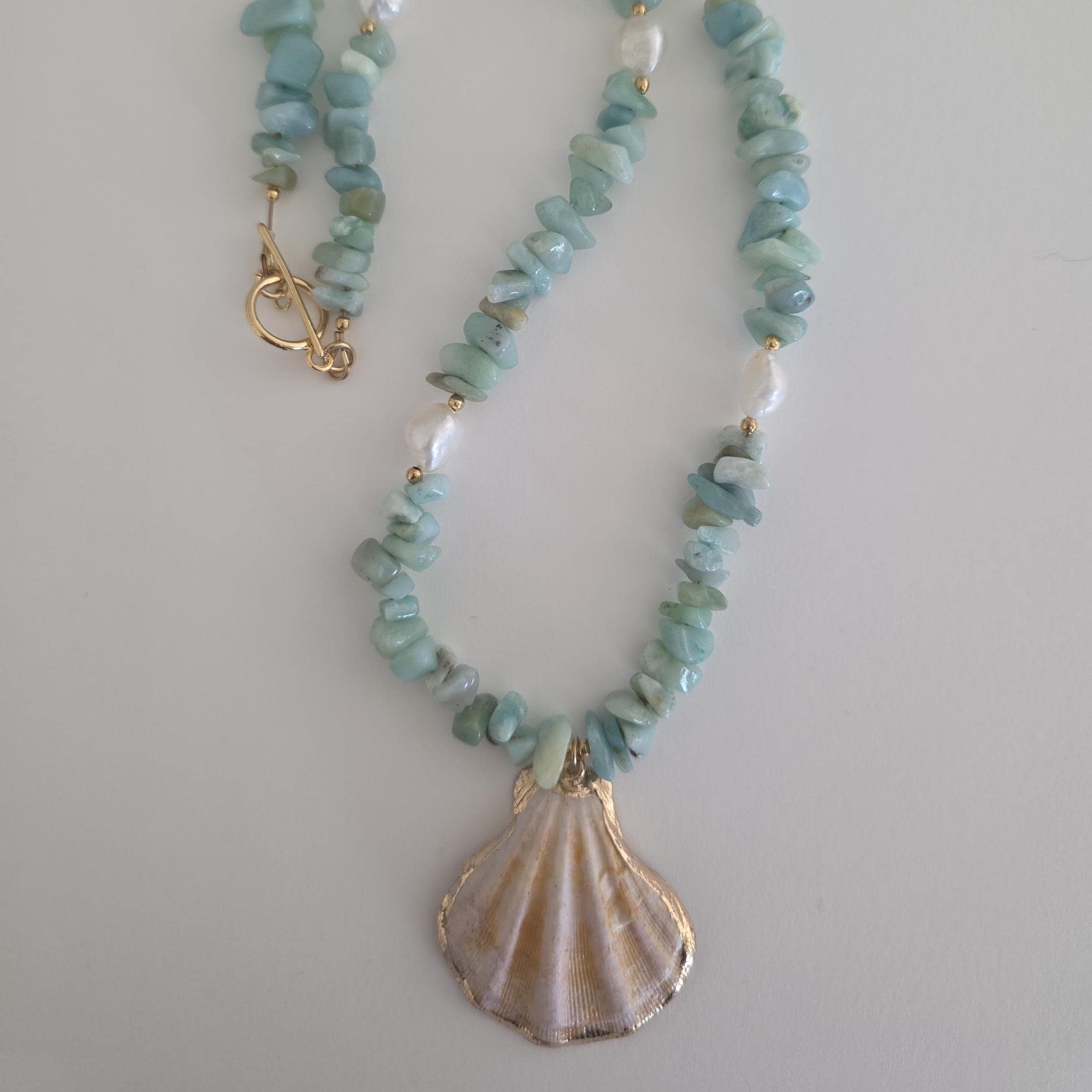 Amazonite nugget necklace with shell pendant, beach jewelry