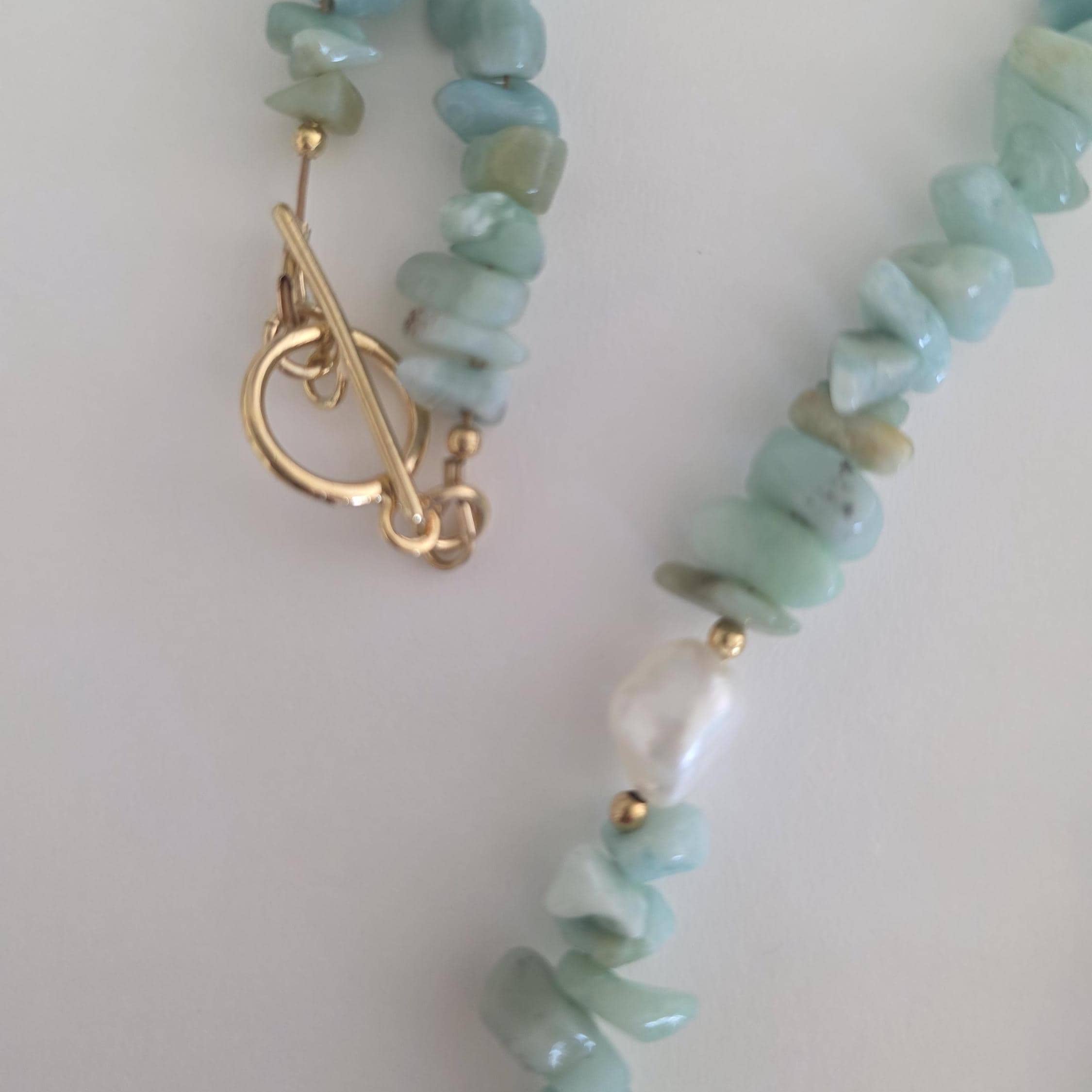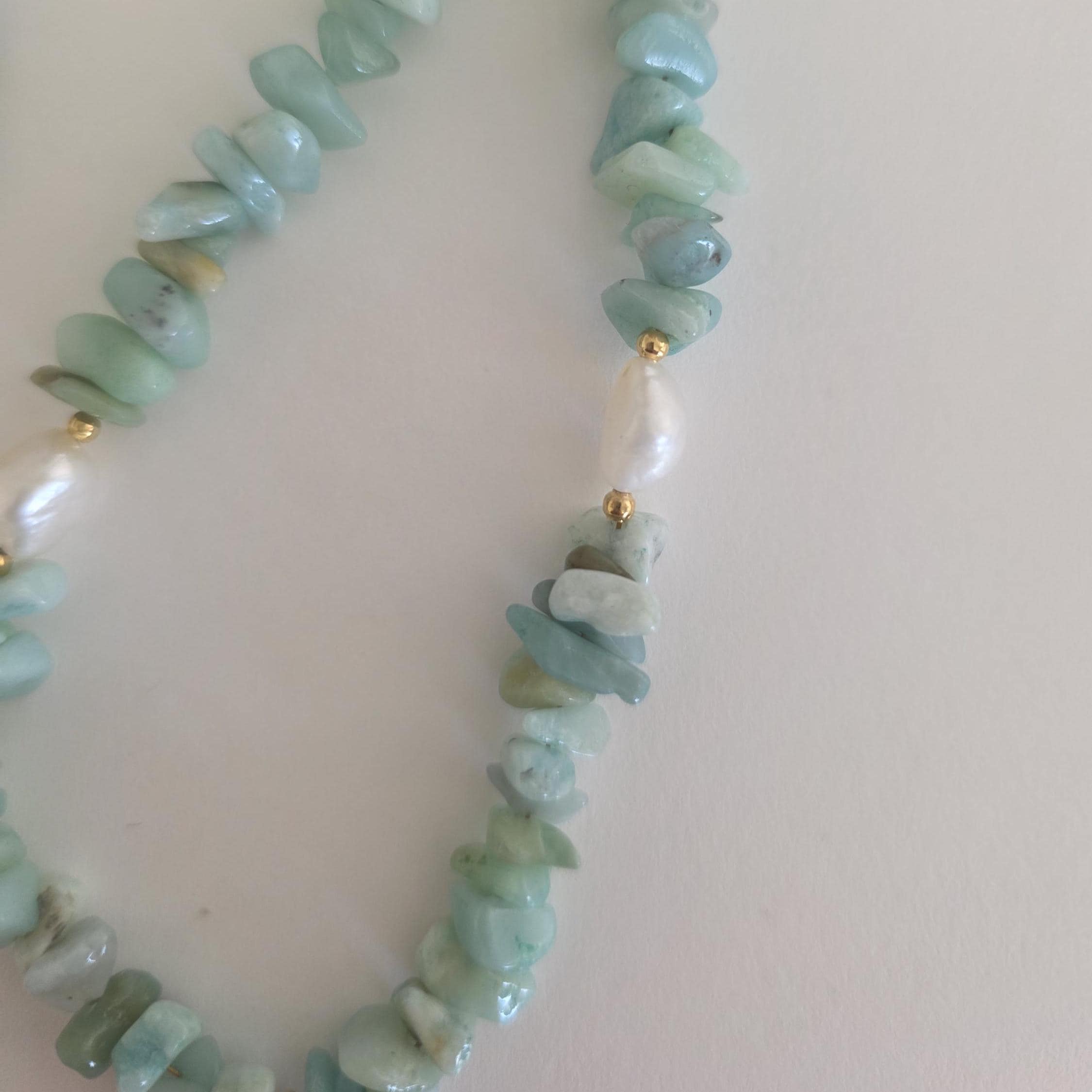 Amazonite chip beads surround nugget freshwater pearls with accents of gold. This necklace is perfect for your summer wardrobe that can be worn alone or layered with others from my shop.