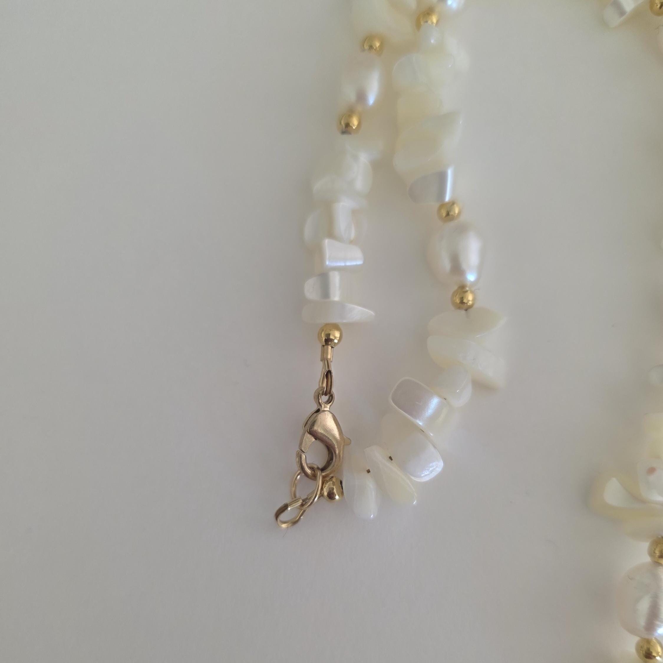 Mother of pearl chips surround freshwater pearls with accents of gold. This necklace is perfect for your summer wardrobe and would make a perfect accessory for a summer wedding that can be worn alone or layered with others from my shop.