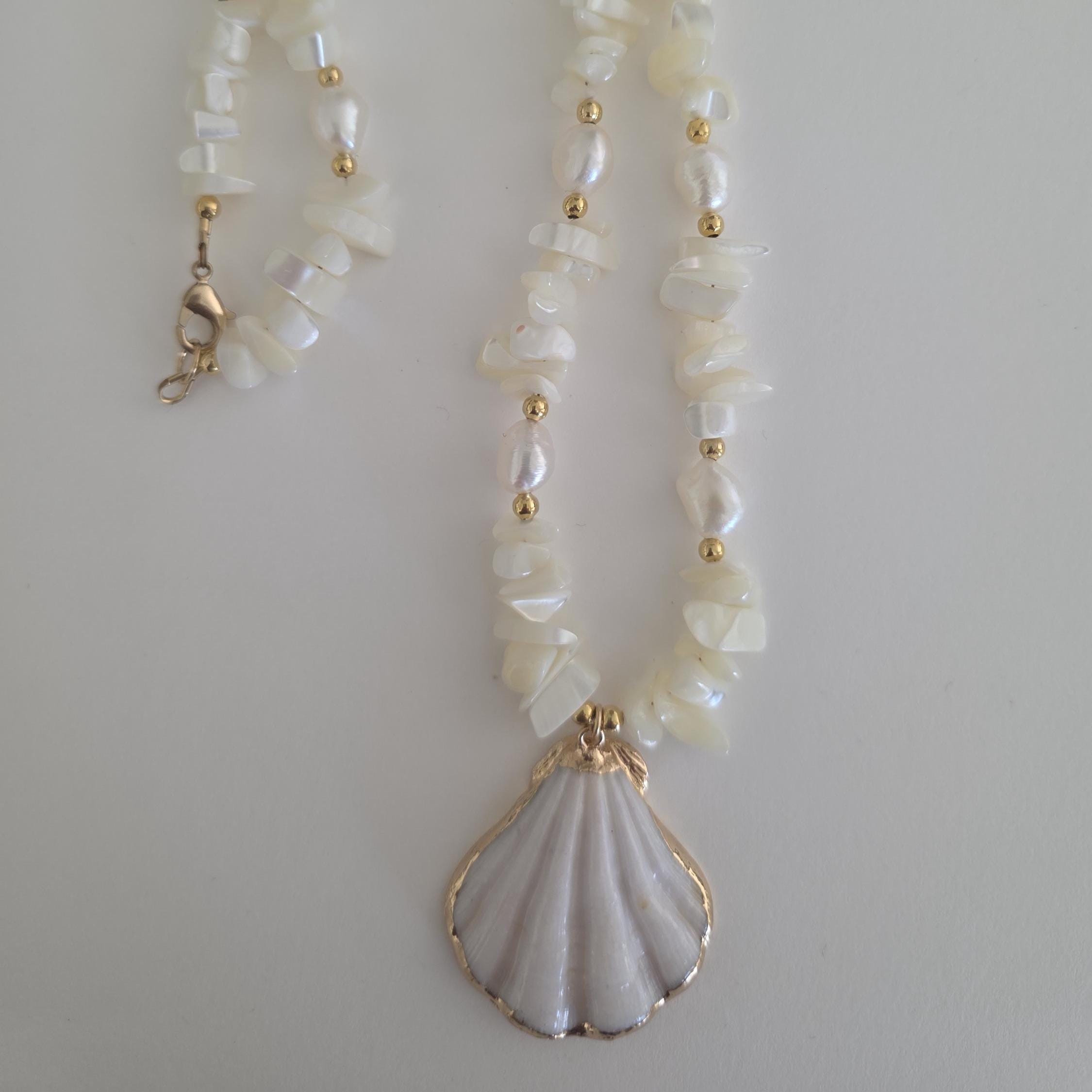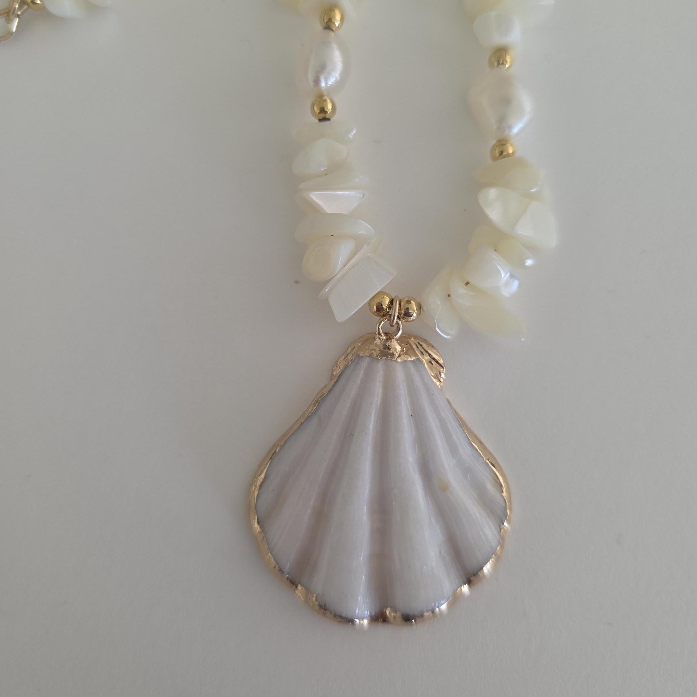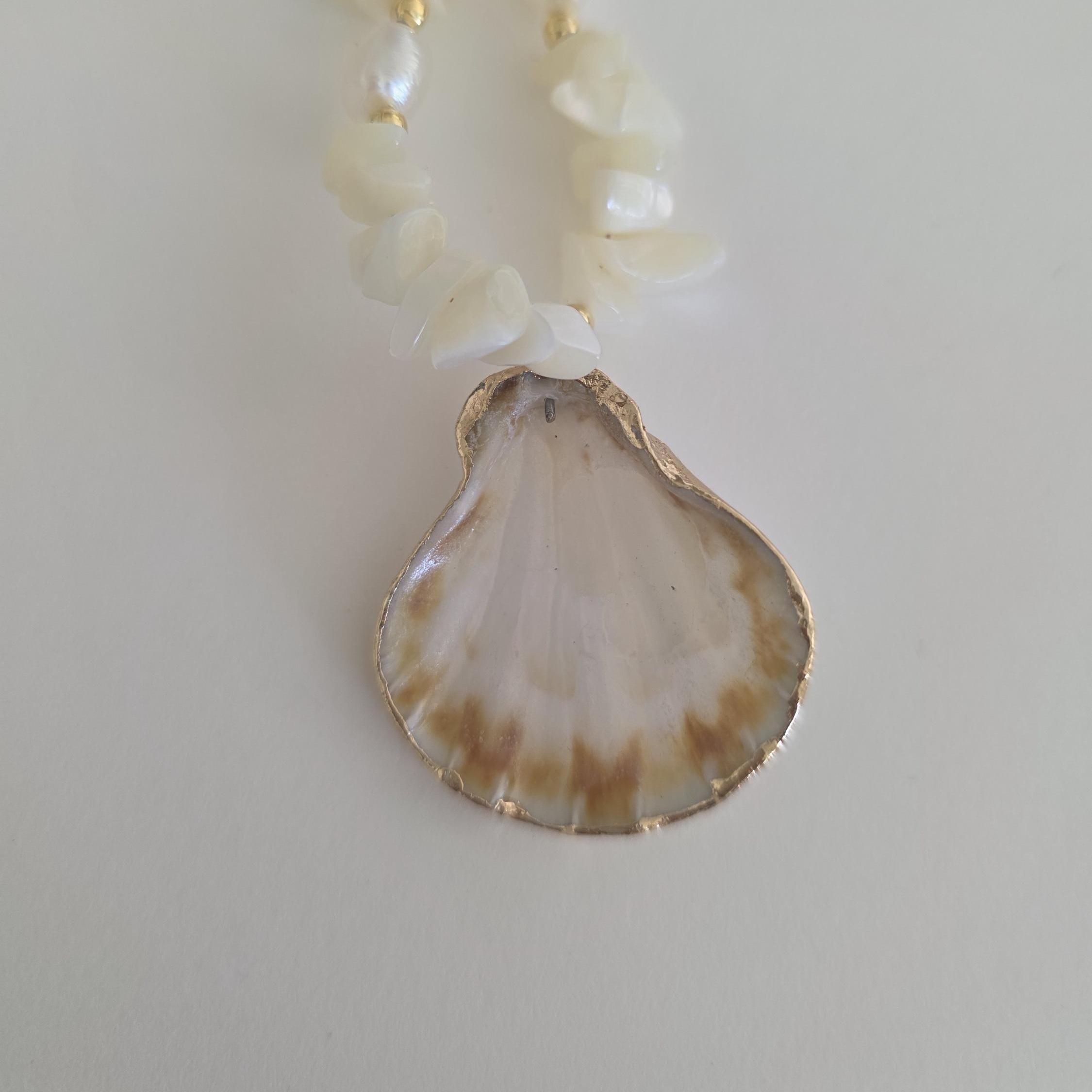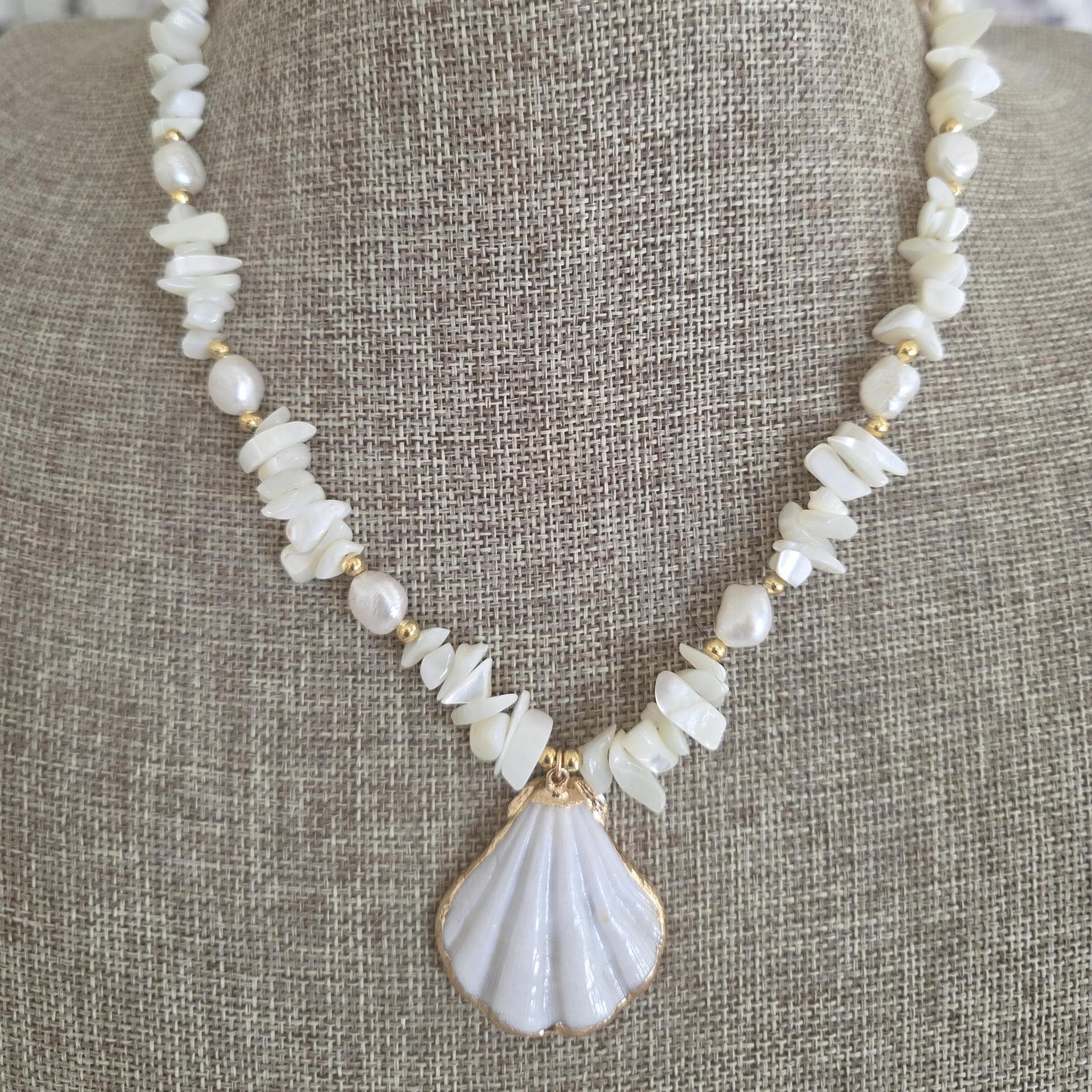 Mother of pearl nugget necklace with shell pendant, beach jewelry
